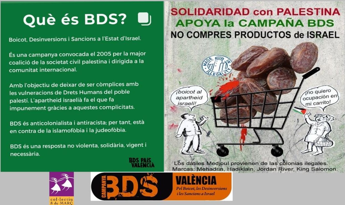 Davant la situació de Guerra entre Israel i Palestina, el Col·lectiu 8 de Març de l’Alcoià i El Comtat dona a conèixer una campanya que anima a no comprar productes d’Israel. La BDS (Boicot, Desinversions i Sancions a l’Estat d’Israel) és una campanya que va ser promoguda per la major coalició de la societat civil palestina al 2005 i que està dirigida a la comunitat internacional.