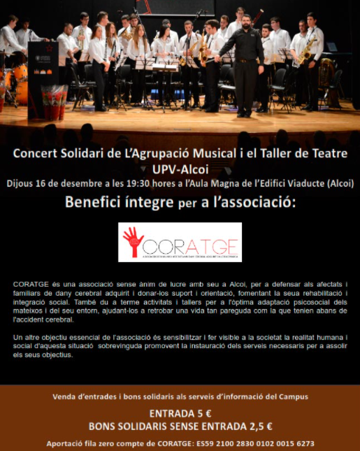 L'Agrupació Musical de l’EPSA, dirigida per Jordi Sempere, i el grup de Teatre interpretaran el tradicional Concert de Nadal del Campus d'Alcoi de la Universitat Politècnica de València (UPV). La recaptació íntegra de les entrades i bons solidaris ‘Fila 0’ anirà destinada a l'associació ‘Coratge’.