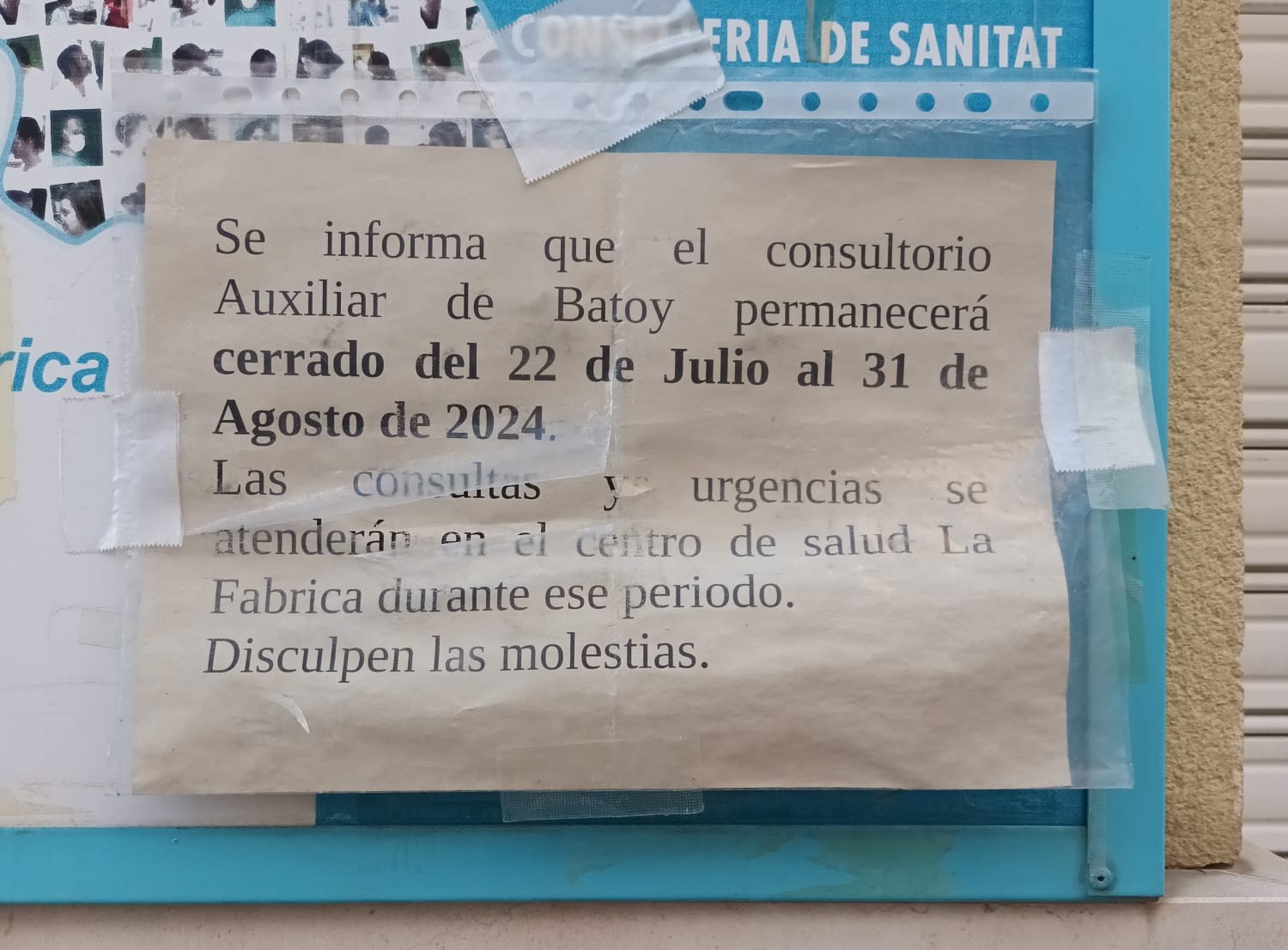 El calendari ha sofrit modificacions, com ja es va avisar que podia passar, i ara s’ha comunicat que el Consultori de Batoi tancarà tot el mes d’agost. El motiu es deu a una falta de personal sanitari del centre, per la qual cosa, el centre de salut romandrà tancat des del 22 de juliol fins al 31 d’agost. Durant aquest període, les consultes i les urgències seran ateses al Centre de Salut la Fàbrica.