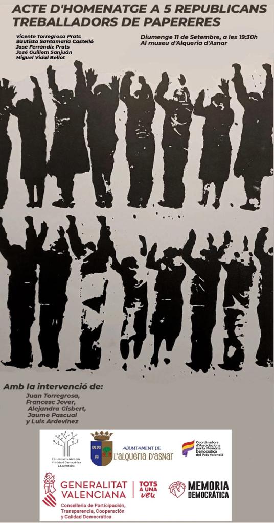 Aquesta primera activitat consisteix en un homenatge a cinc treballadors paperes: Vicente Torregrosa, Bautista Santamaria, José Prats, José Guillem, Miguel Vidal. Torregrosa va ser un alcalde revolucionari en la realització i implantació d'avançades mesures dirigides al benestar de les veïnes i veïns del seu estimat poble de l'Alqueria, com explica la seua filla Amparo Torregrosa. La casa per al Mestre, plantació d'arbres a l’Escola, subvenció de viatges als escolars per banyarse a la mar, fonts públiques, compra de bombes per a l'aigua potable. Per totes aquestes accions i ser Republicà i sindicaliste de la UGT, va ser perseguit i detingut a l'acabar la guerra, juntament amb els seus companys de Comité Municipal.