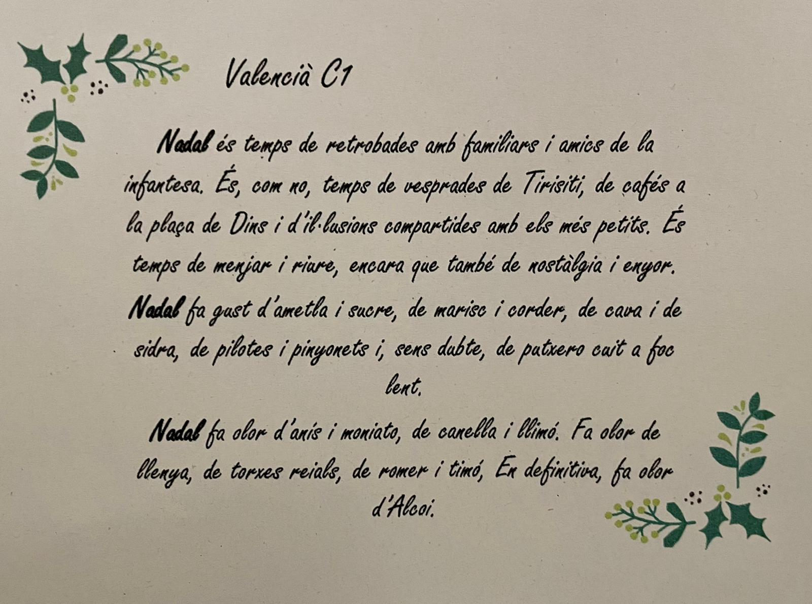 Cadascún dels departaments ha triat la millor postal i en el cas de valencià, la guanyadora va ser l'escrita pel grup de C1 de valencià. La temàtica està relacionada amb el Nadal Alcoià.