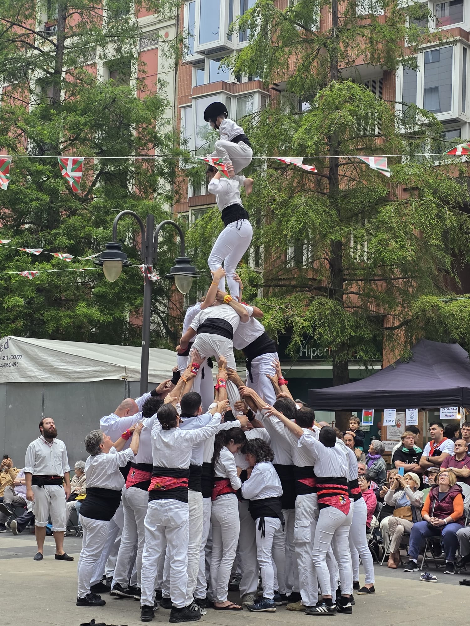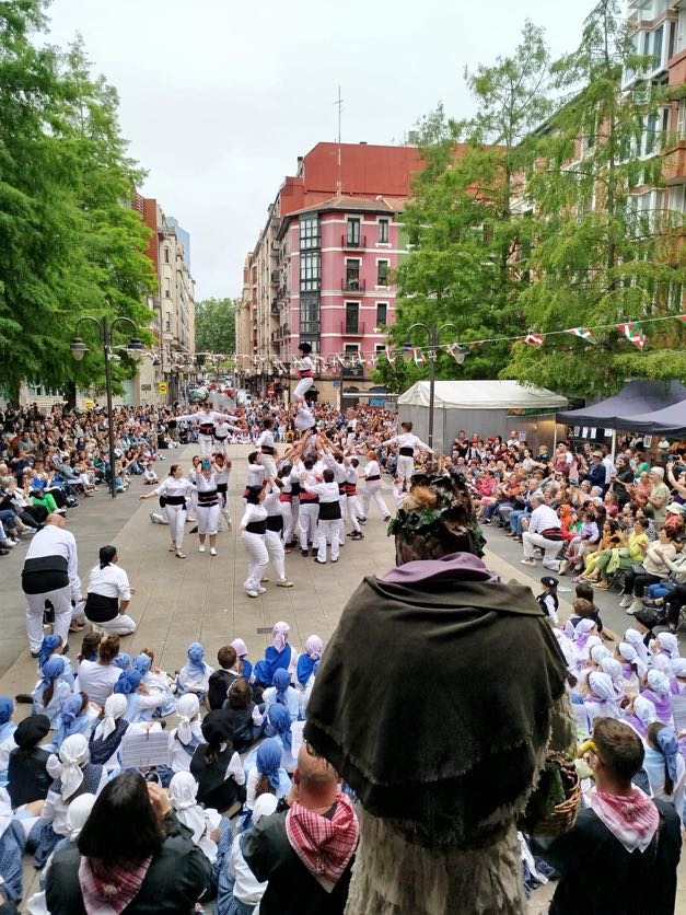 A més a més, "de vesprada vam fer cercavila amb el Mal Passet i el grup de danses Salbatzaile des de la seua seu fins a la plaça del Funicular. Allà vam gaudir de diferents danses populars basques, vam fer fins a 9 figures diferents, que jo crec que van deixar impressionats els més de 1.000 assistents que hi havia a la plaça. Després, parlant amb ells, vam saber que els havia impressionat la nostra xicalla, que va coronar figures de 4 alçades, la varietat de les diferents muixerangues que fem i la gràcia de la figuereta, que és la figura coronada per un muixeranguer cap per avall. També ens van dir que es van emocionar molt quan, en la figura final, vam desplegar la nostra senyera amb la ikurriña, un cartell a favor del valencià (que està sent menyspreat pel govern autonòmic de dretes actual) i la bandera de Palestina, que vam mostrar per conscienciar sobre el que està patint el poble palestí".