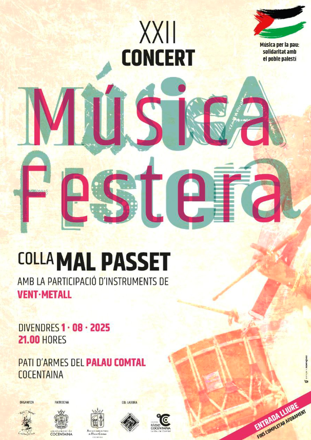 El pati del Palau Comtal de Cocentaina acollirà el divendres 1 d’agost, a les 21:00 hores, una nova edició del concert de música festera a càrrec de la Colla de Dolçaines i Percussió Mal Passet. Aquesta actuació, que enguany celebra la seua 22a edició, dona inici a la Setmana Festera de Cocentaina. L'entrada es lliure fins completar l’aforament.