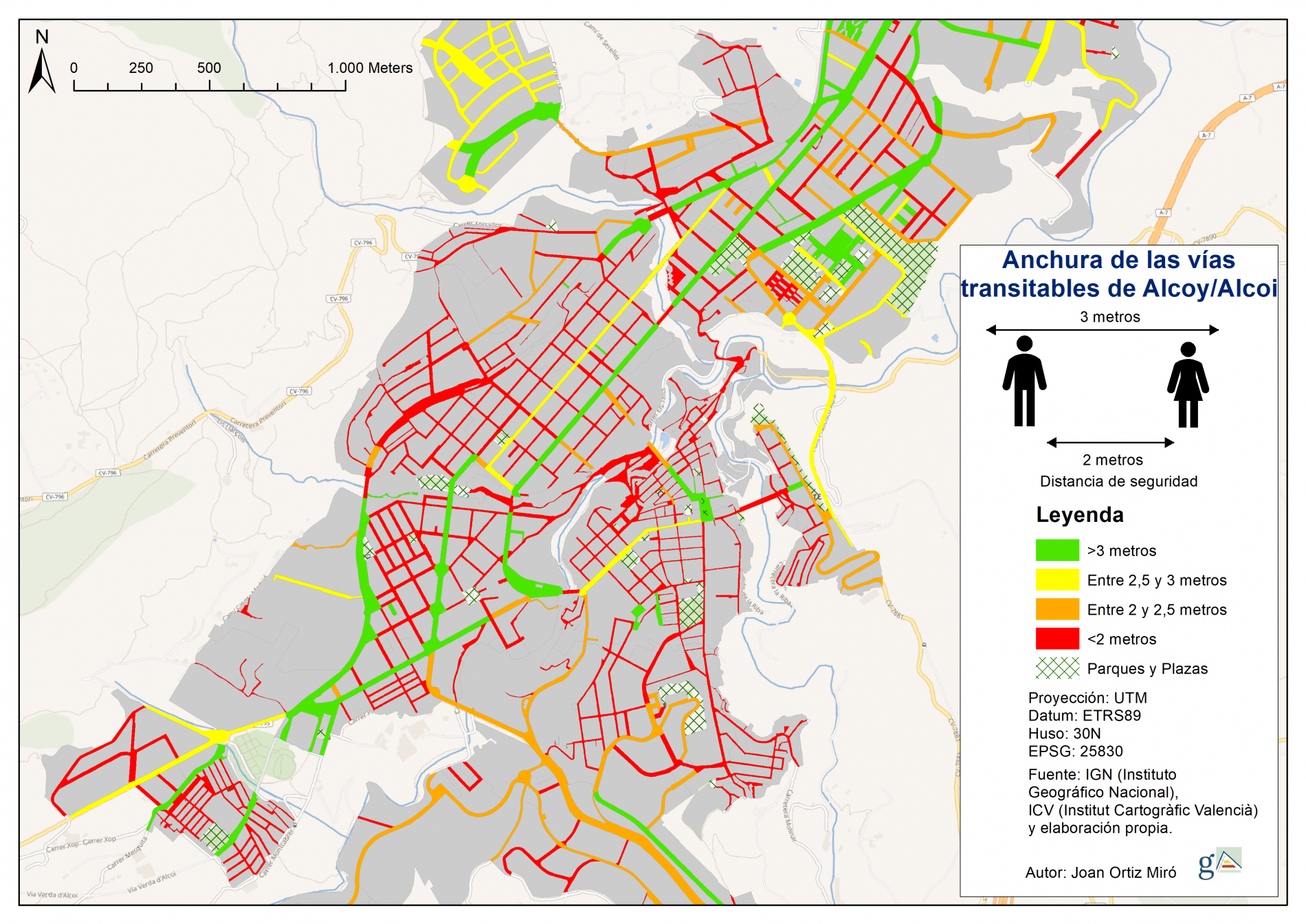 Joan Ortiz ha utilitzat sistemes d'informació geogràfica per satèl·lit que li han permés mesurar les voreres de tota la ciutat sense incomplir el confinament. També ha tingut en compte els canvis fets a la ciutat, com l'habilitació del carril bus per a les persones, i que amplia l'espai de passeig. Després s'han establit 4 categories depenent de l'amplària de les voreres. En les més amples, les de color verd, hi ha més de 3 metres, així que tot i que el creues en algú pots mantindre la distància. Les més estretes són les de color roig, amb menys de dos metres d'amplària, i en aquestes Joan Ortiz considera important seguir la recomanació municipal de caminar sempre per la vorera de la dreta per evitar encreuaments.