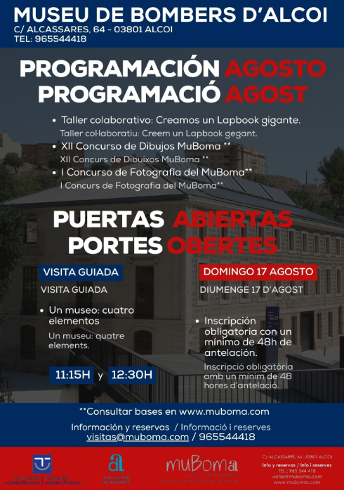 El dissabte 17 d’agost se celebrarà una jornada de portes obertes amb visites guiades a les 11:15 h i a les 12:30 h, sota el títol “Un museu: quatre elements”. Per a participar, caldrà inscriure’s amb un mínim de 48 hores d’antelació a través del correu visitas@muboma.com o telefonant al 965544418.