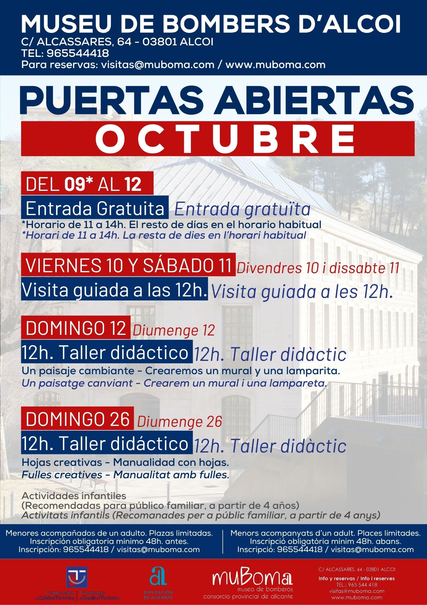 Les places per a aquestes activitats són limitades, per la qual cosa és necessària la inscripció prèvia amb un mínim de 48 hores d’antelació. Les reserves poden realitzar-se a través del correu visitas@muboma.com o al telèfon 965 544 418.