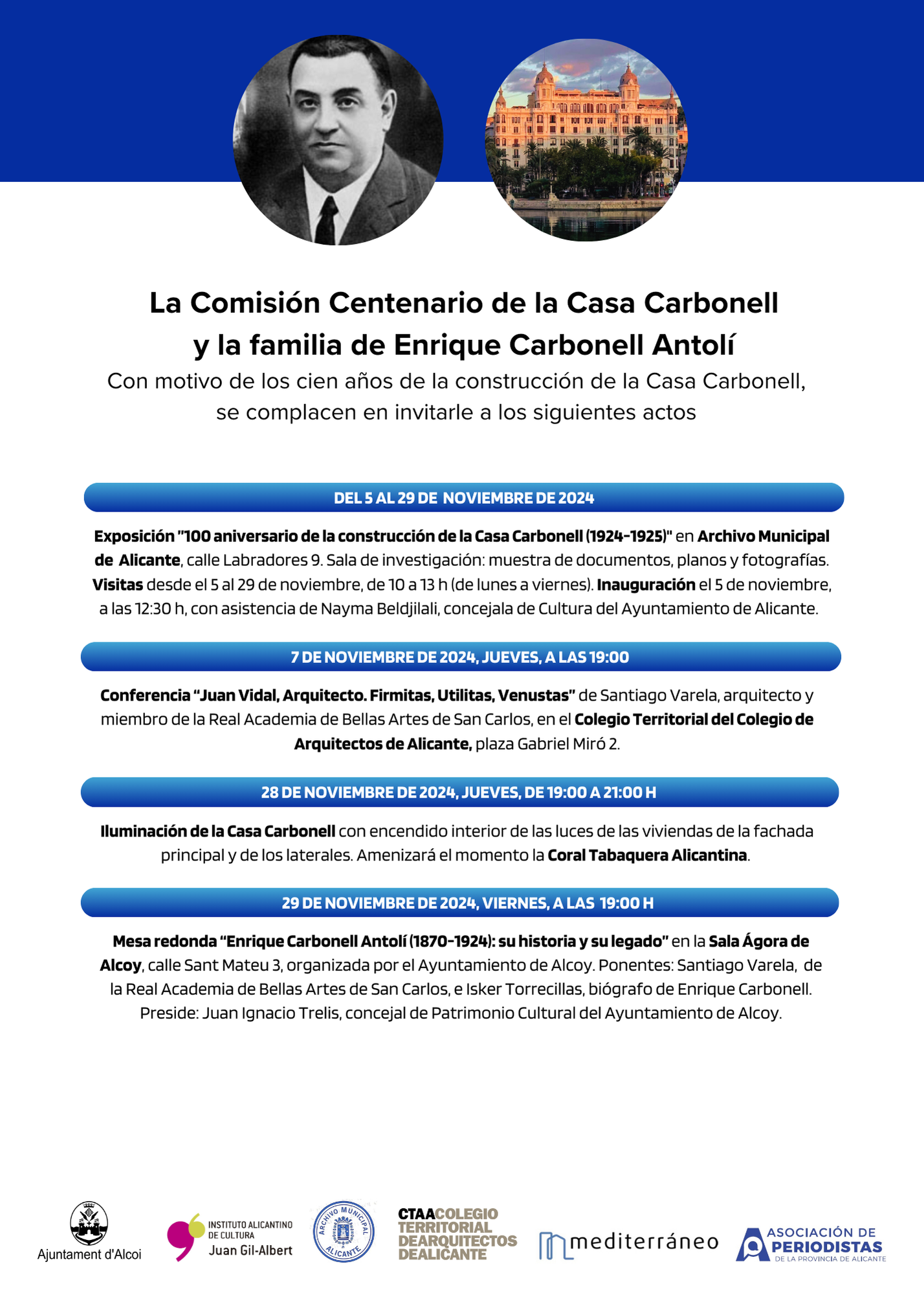 Tot i que encara no se celebra el centenari “redó”, la Comissió del Centenari ha preparat per a novembre una llarga sèrie d’activitats, començant per una exposició a l’Arxiu Municipal d’Alacant (entre el 5 i el 29 de novembre), una conferència al Col·legi d’Arquitectes d’Alacant el 7 de novembre a les 19 hores, una encesa de llums el 28 de novembre o una taula redona en l’Àgora d’Alcoi el 29 de novembre a les 19 hores, en la qual intervé Santiago Varela (Reial Acadèmia de Belles Arts de Sant Carles), el biògraf d'Enrique Carbonell lsker Torrecillas; i Juan Ignacio Trelis, regidor de Patrimoni Cultural d'Alcoi.