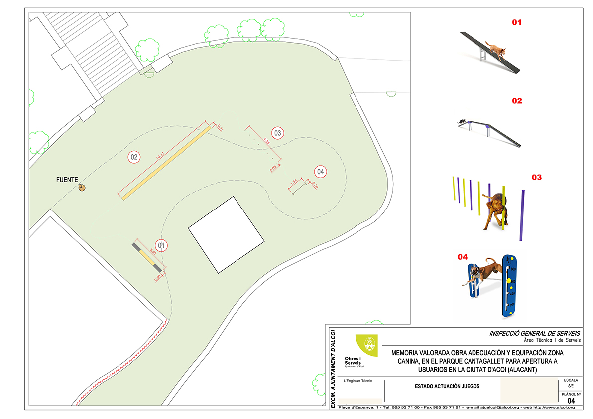 Les obres a efectuar han de demolir en primer lloc la part de l’estany i adequar l’espai a una zona canina. Després caldrà construir una plataforma sobre la que es col·locaran aparells canins de joc.