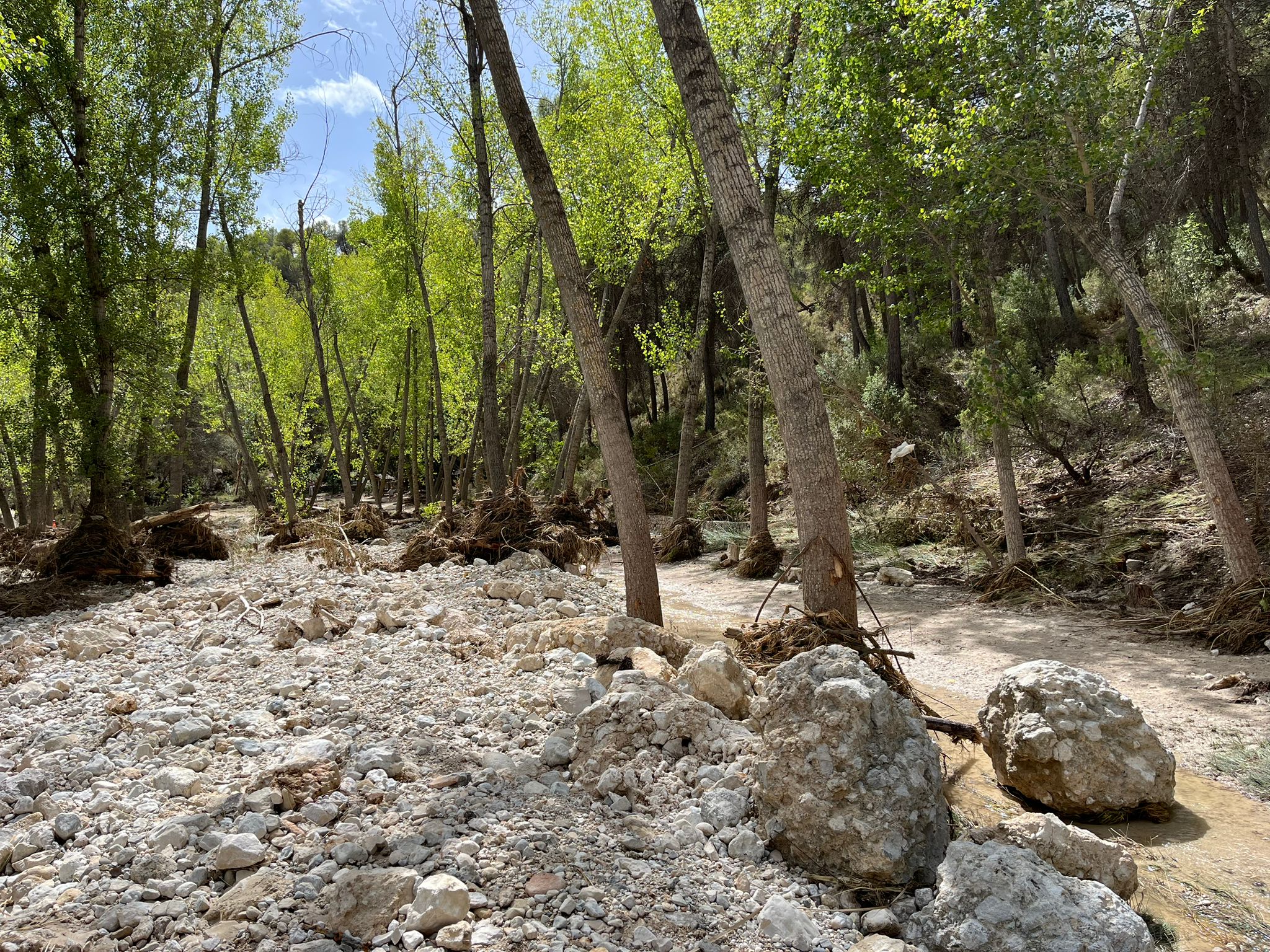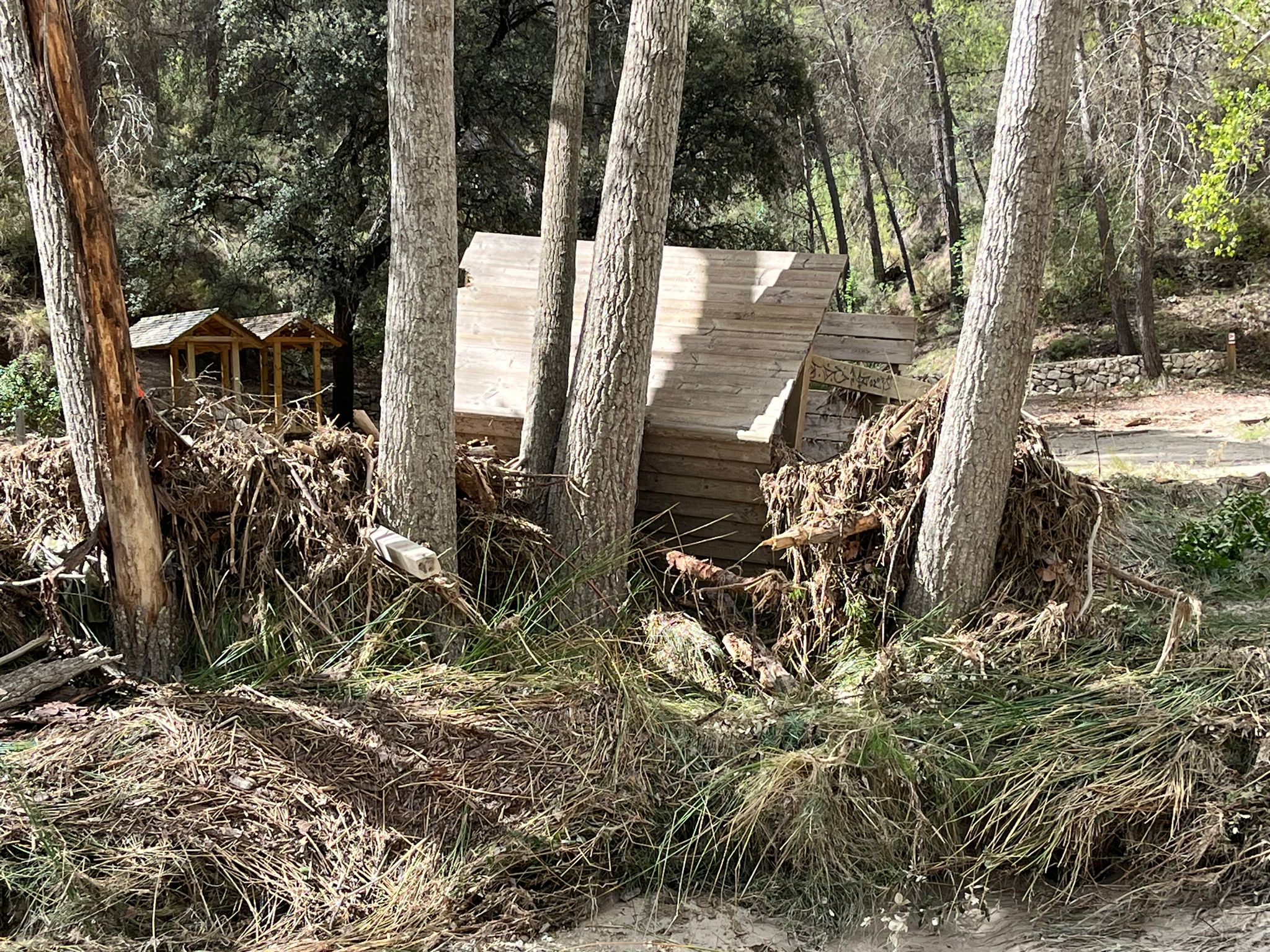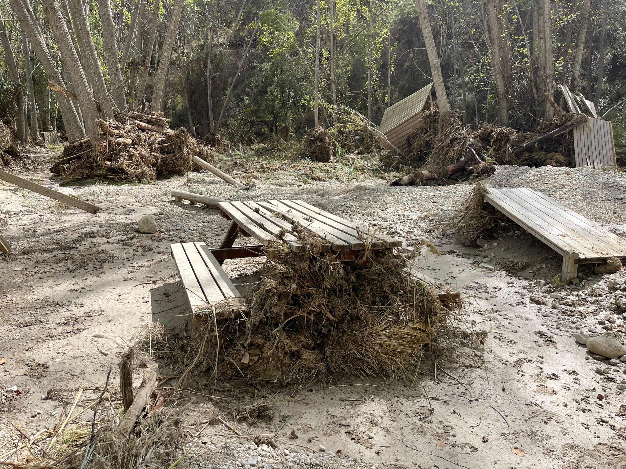 Ni banquets, ni taules, ni ponts de fusta, ni sostres... tot ha estat arrossegat per l'aigua i ara es troba esclafat en la zona més baixa del Racó. A banda d'estar tot destrossat, els sediments de pedra arrossegats per l'aigua han desfigurat tota l'àrea recreativa.