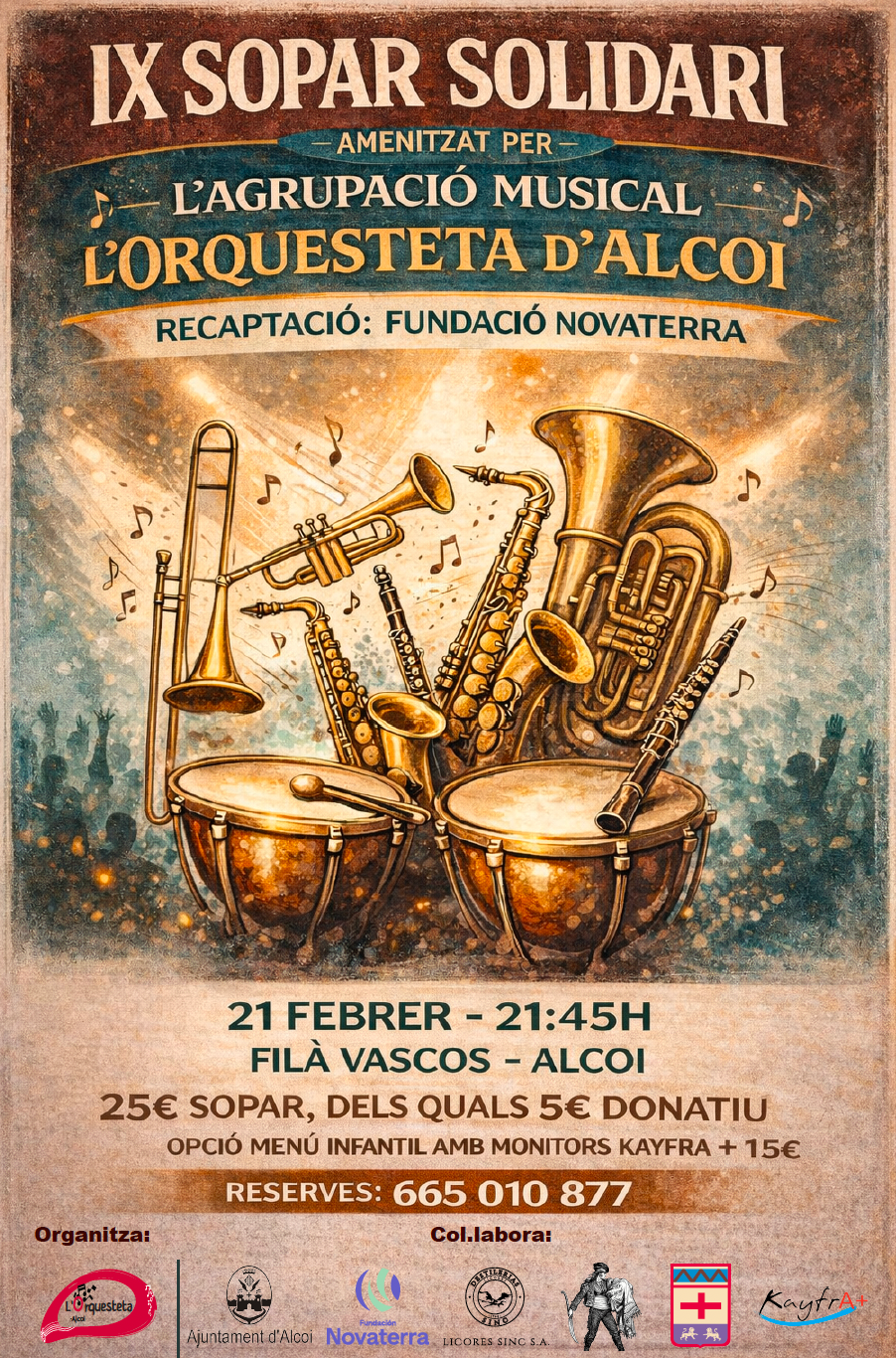 El IX Sopar Solidari compta amb la col·laboració de l’Ajuntament d’Alcoi, Destilerías Sinc, la Filà Vascos, Diego Bandolero, Kayfra+ i la Fundació Novaterra.