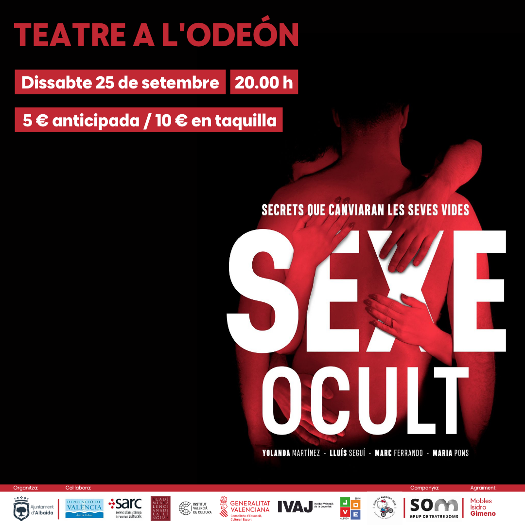 L’obra de teatre El sexe ocult (secrets que canviaran les seues vides) arriba al teatre Odeón d’Albaida el 25 de setembre a les 20.00h, amb una restricció per als menors de 13 anys. Les entrades es troben al preu de 5 euros anticipadament a l’Oficina de Turisme d’Albaida així com en AFMAVA o els Kintos 2022.