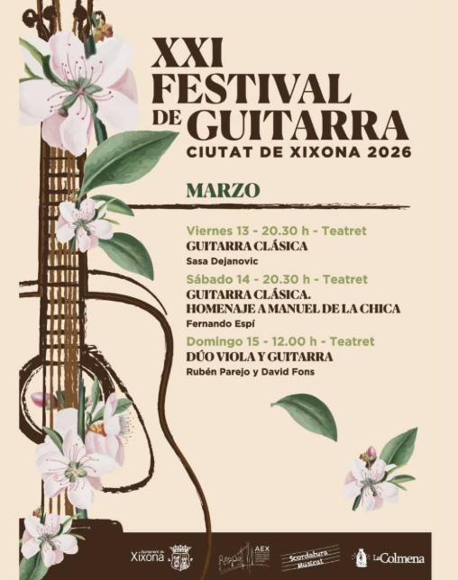 El dissabte 14 de març, també a les 20:30 hores, el festival continuarà amb un concert de guitarra clàssica dedicat a Manuel de la Chica, interpretat pel guitarrista Fernando Espí, en un recital que servirà com a homenatge a aquesta figura destacada del món de la guitarra.