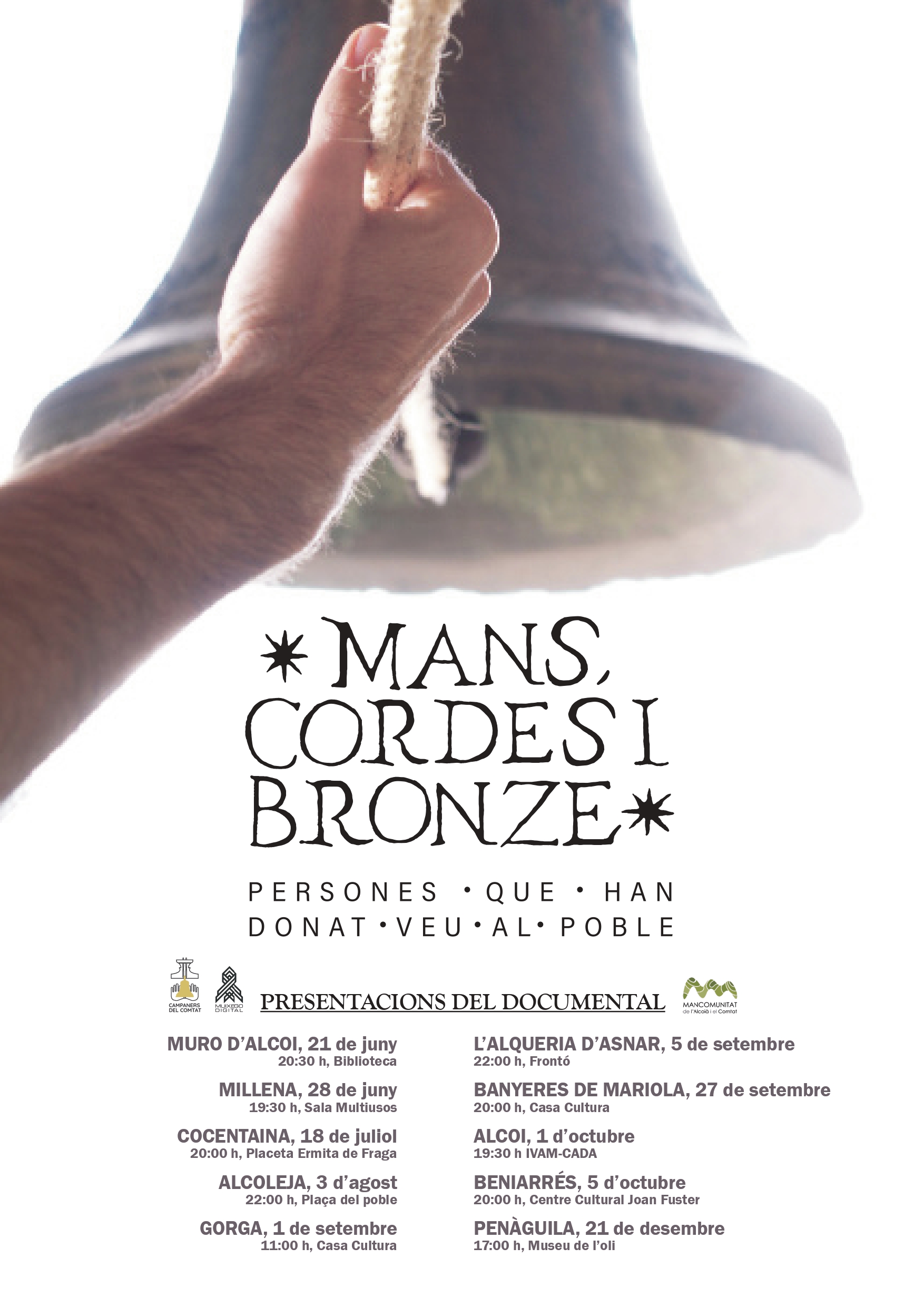 Els Campaners del Comtat, juntament amb la Mancomunitat de l’Alcoià i el Comtat, han produït un documental, “Mans, cordes i bronzes. Persones que han donat veu al poble”, amb l’objectiu de reivindicar el toc manual de campanes mitjançant els testimonis dels últims campaners.