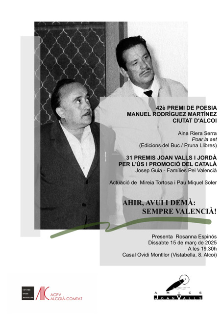 La vetlada se celebra aquest 15 de març al Casal Ovidi Montllor a les 19:30h sota el lema: ‘Ahir, avui i demà: sempre valencià’. En aquest esdeveniment s’entreguen els 31 Premis Joan Valls i Jordà per l’Ús i Promoció del Català i també s’entrega el guardó de la 42 edició del Premi de Poesia Manuel Rodríguez Martínez Ciutat d’Alcoi.