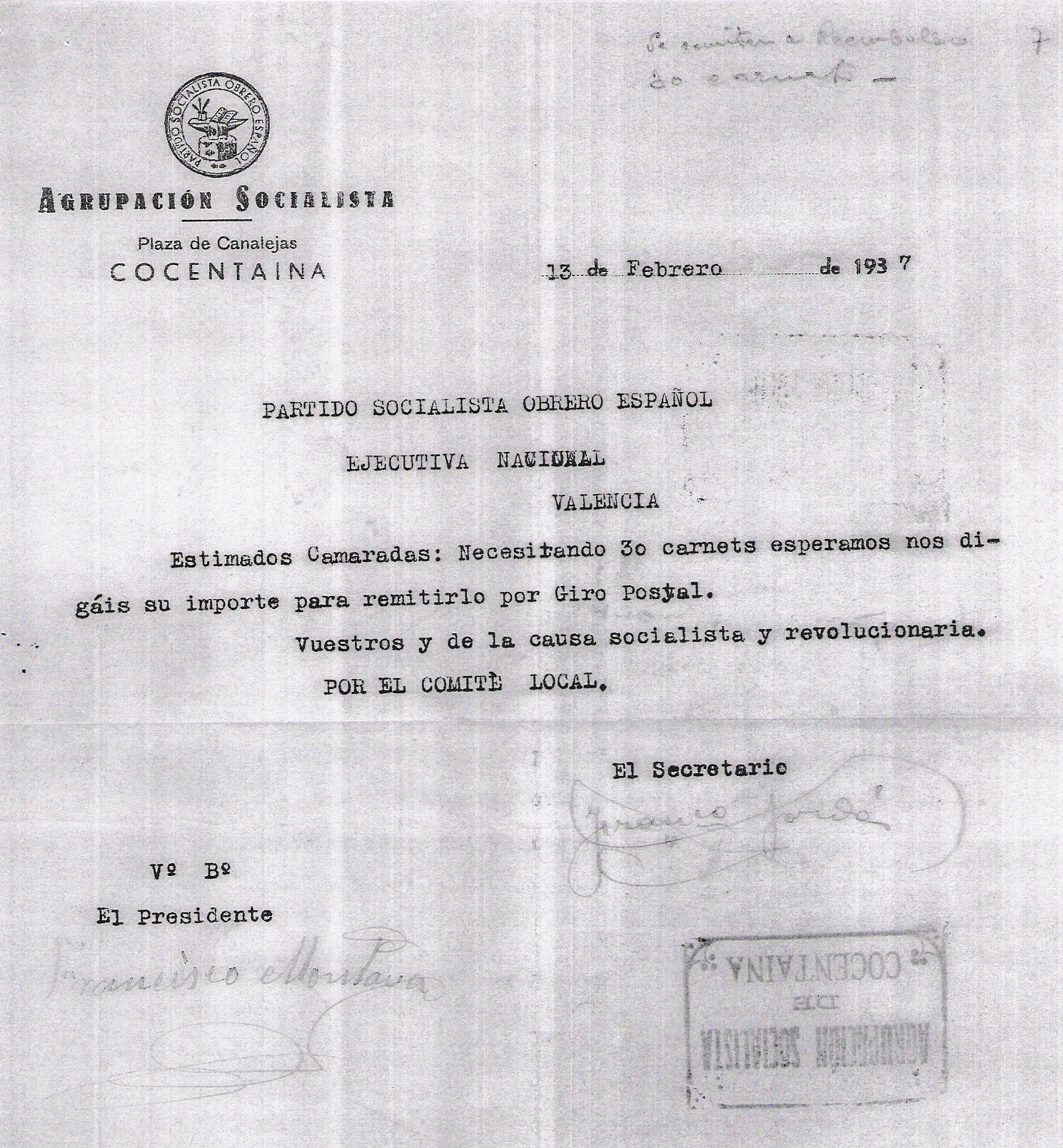 Francisco apareix com afiliat i membre de l’Agrupació Socialista de Cocentaina el 1932. També figura com a conseller del primer govern municipal del Front Popular, que fou format el 19 de novembre de 1936. A primeries de 1937 era president de l’Agrupació Socialista local i el mateix any se’n va anar voluntari a la guerra. A més, el Diari del Ministeri de Defensa confirma ser anomenat sergent de l’exercit popular des de l’1 d’abril de 1937. Per informació oral dels fills sabem que va comandar la vigilància d’un polvorí al front d’Extremadura.
