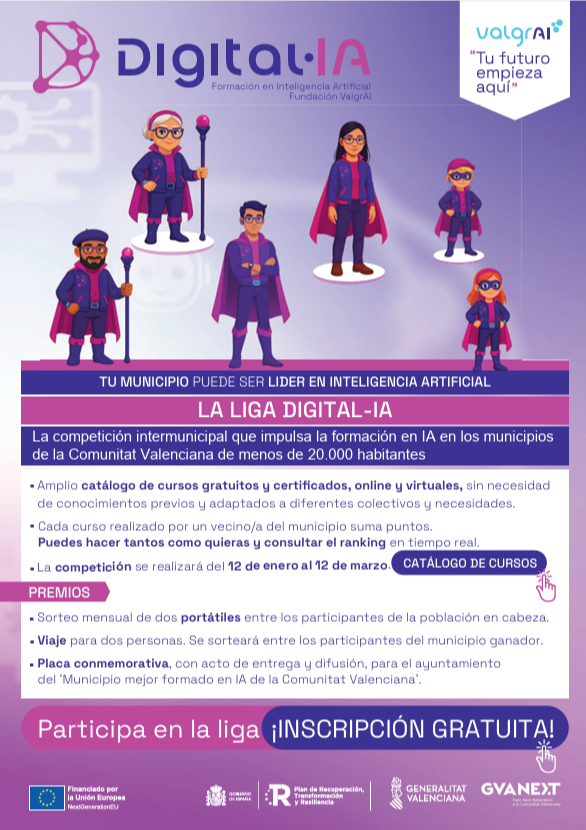 Tots els municipis de la Comunitat Valenciana amb menys de 20.000 habitants poden començar a participar en una amplia oferta de cursos gratuïts i certificats per a persones de totes les edats amb l’objectiu d’impulsar la formació en Intel·ligència Artificial sota el títol de ‘Liga Digital-IA’.