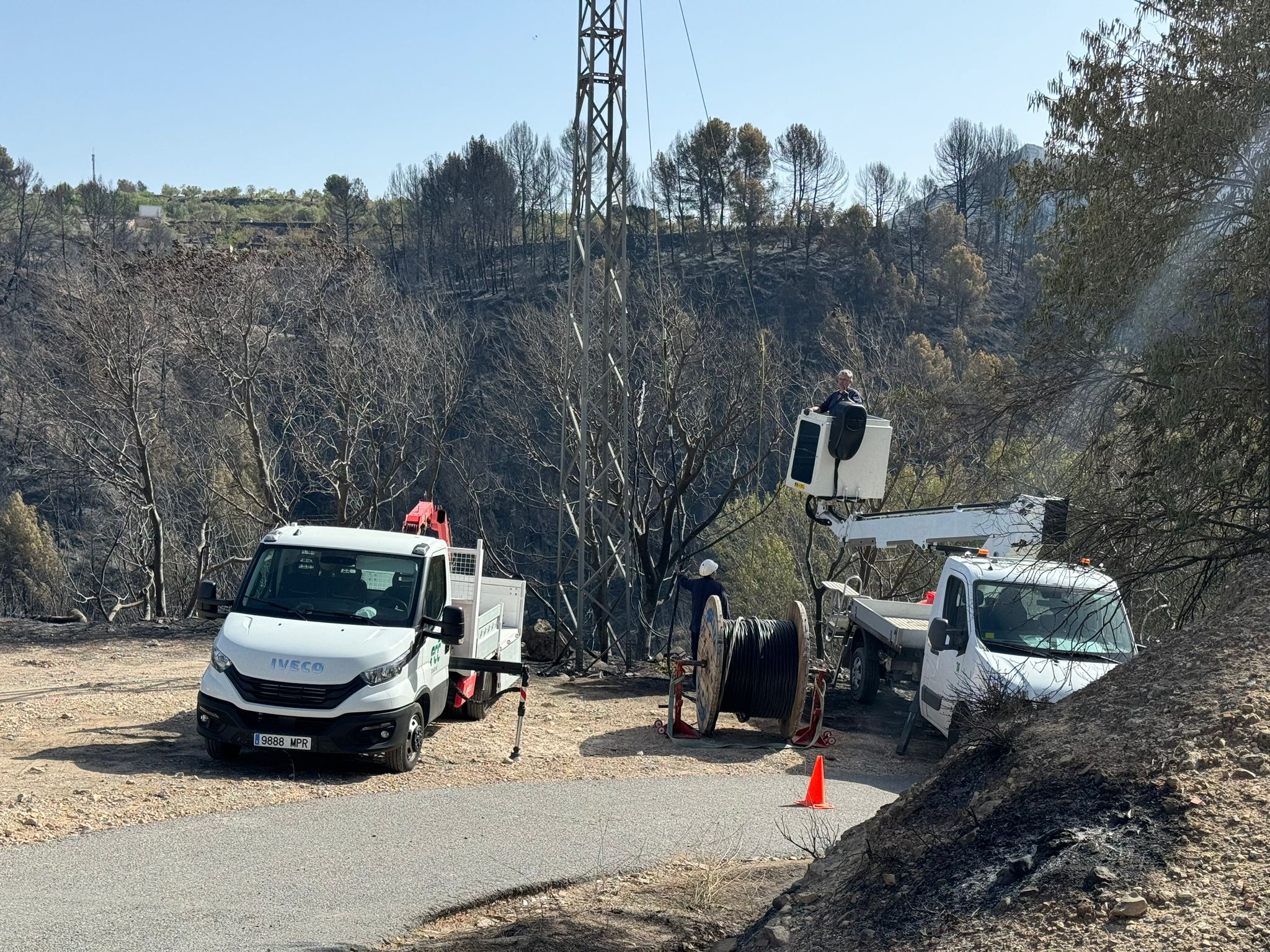 També es poden veure altres treballadors, restablint el cablejat caigut per a que la localitat puga tornar a tindre electricitat o reparant les canonades que han patit rebentons. Hi ha alguns problemes de connectivitat a causa de l’incendi que estan treballant per que torne a la normalitat.