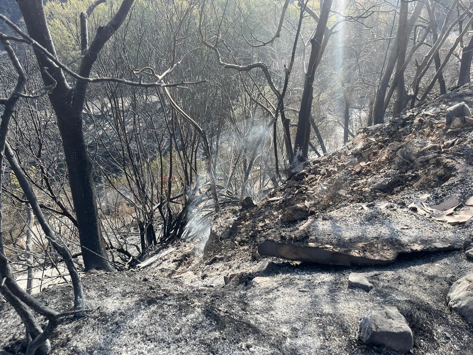 L’incendi, encara que ja no es veuen flames, segueix actiu, però està estabilitzat i evoluciona favorablement. En total, s'han calcinat 327 hectàrees i té un perímetres de 15 quilòmetres. El foc ha cremat més del 50% del Jardí de Santos.
