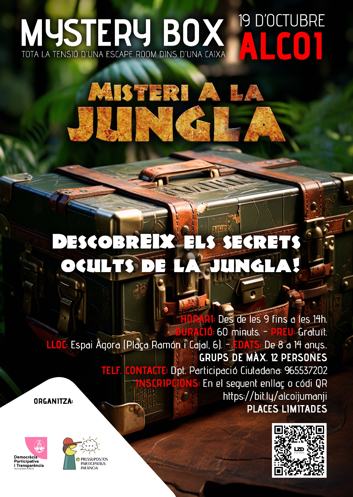 L’activitat es desenvolupa aquest 19 d’octubre sota el títol: Misteri a la Jungla, un Escape Room dirigit a xiquets i xiquetes d’entre 8 i 14 anys. Aquest tindrà lloc a l’Àgora de 9h a 14h en sessions de 45 minuts i grups de 12 persones.