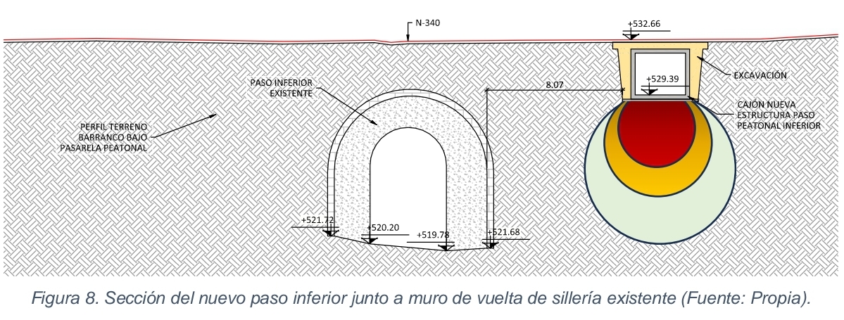 Sota eixe pont ja existeix un pas inferior per a l'aigua, fet en mur de pedra, que no interfereix en l'obra, però que cal assegurar durant l'excavació per evitar despreniments.