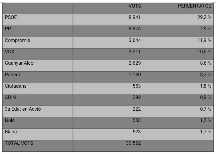Amb l'escrutini definitiu, els vots a Alcoi per a les municipals 2023 queden així: