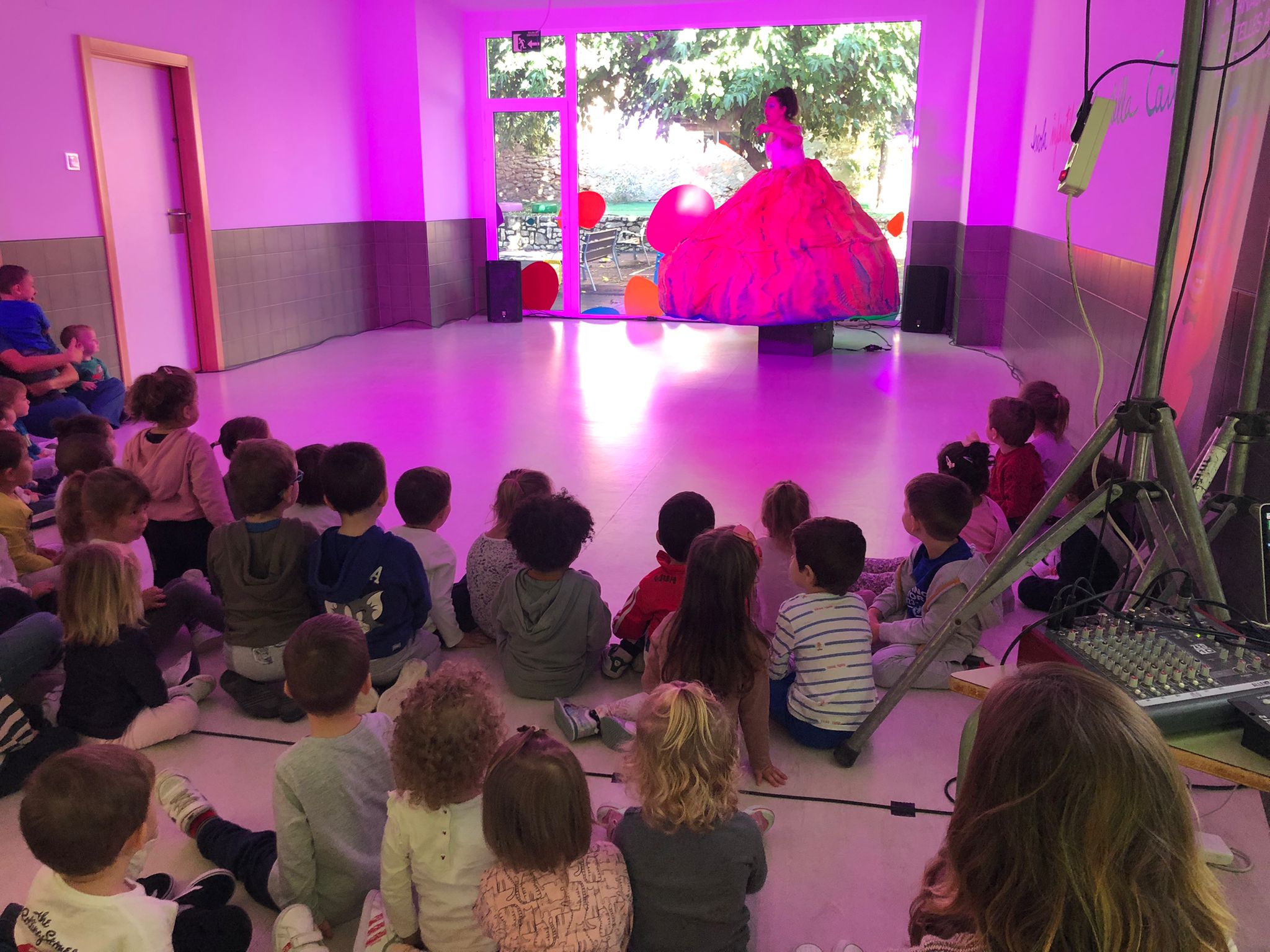 L’inici s’ha fet aquest matí amb una actuació ‘Volcán azul’ de la mà de Begoña Tena a l’Escoleta Municipal. Huit anys porta Tena representant aquesta obra sent ella mateixa una titella humana de grans dimensions en la que juga a ser un volcà terrestre i acaba sumergint-se a les profunditats marines amb un peixet que articula un senzill ‘Glup’ ‘Glup’. I és que l’actuació es dirigeix a xiquets i xiquetes d’entre 0 i 4 anys i no té cap tipus de text més enllà de dues paraules i monosíl·labs solts, sons, música, llums i moviments. Una titella pròxima que acaba asseguda a terra amb els més menuts.