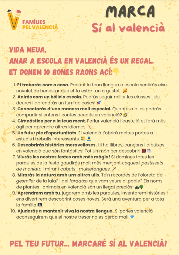 A nivell lingüístic nombrosos estudis han demostrat els avantatges i beneficis de parlar més d’una llengua. “Estudiar en valencià a l’escola és un dret dels nostres fills i filles; fora del context escolar no és tan fàcil aprendre’l, hi ha un predomini del castellà als llibres, cinema, pel·lícules, al carrer, als mitjans de comunicació, etc. l’escola ha de salvaguardar la llengua”, explica i argumenta que a més, és més fàcil aprendre una llengua quan un és menut que ja d’adults.