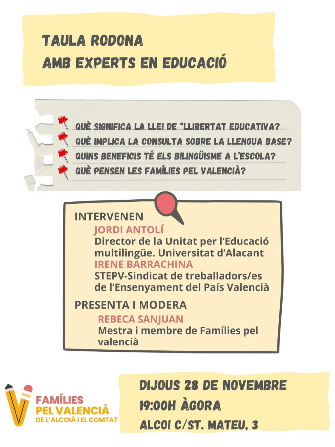 L'acte està destinat tant a famílies com a docents i a interessats en les implicacions que tindrà la nova llei aprovada per la Conselleria d'Educació. Estarà impartida per Jordi Antolí, professor de la Universitat d'Alacant i membre de la Unitat d'Educació Multilingüe, Irene Barrachina, de l'STEPV i serà moderada per la mestra Rebeca Sanjuan.