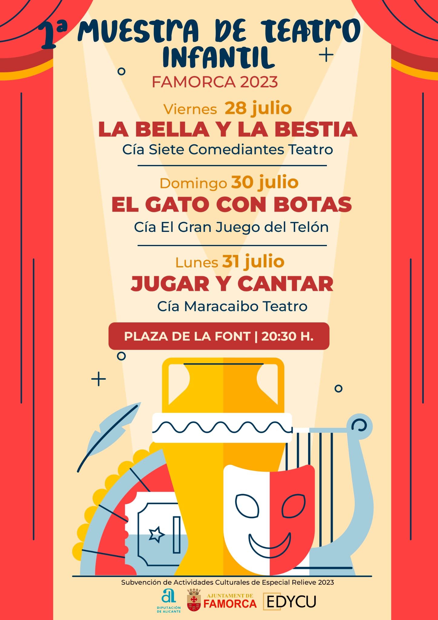 La primera de les obres que conforma la I Mostra de Teatre Infantil, “La bella i la bèstia”, a càrrec de Siete Comediantes Teatre, va tenir lloc el 28 de juliol. A aquesta segueixen dues actuacions més que no et pots perdre: el diumenge 30 de juliol “El gat amb botes” de la companyia El Gran Juego del Telón i el dilluns 31 de juliol “Jugar i cantar” de Maracaibo Teatro.