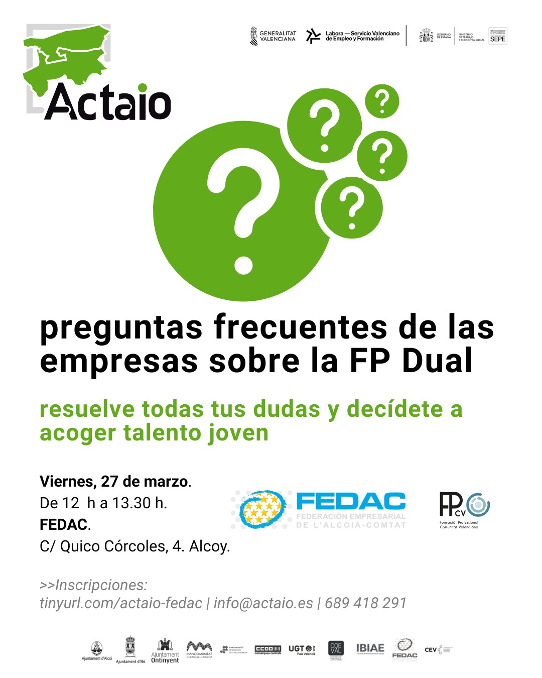 La sessió tindrà lloc el pròxim divendres 27 de març, de 12.00 a 13.30 hores, a la seu de FEDAC a Alcoi (carrer Quico Córcoles, 4), i està oberta a totes aquelles empreses interessades a incorporar alumnat en formació dins de les seues organitzacions.