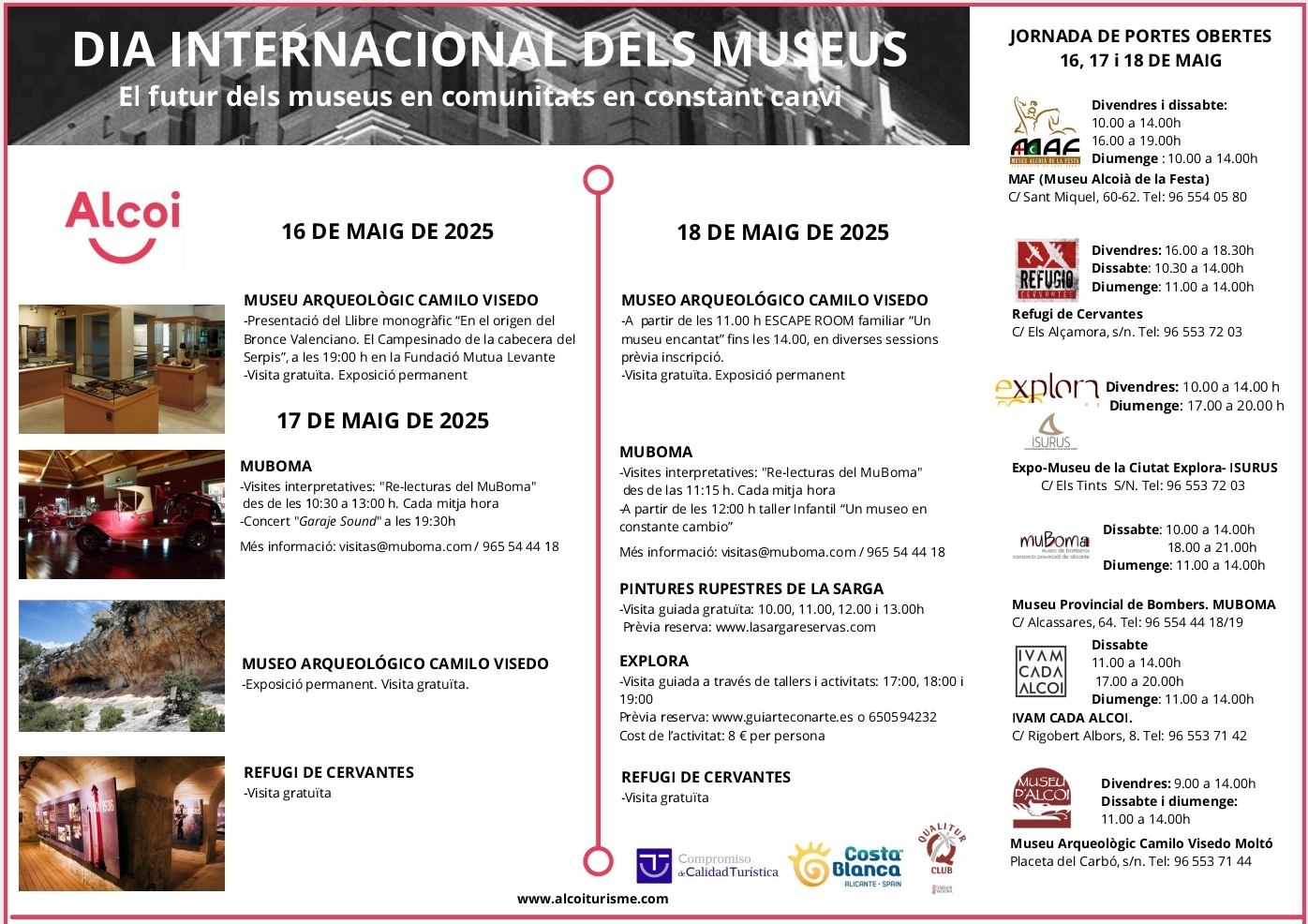 Este mateix divendres 16 de maig s'inicia a Alcoi la celebració pel Dia Internacional dels Museus, que ací s'allarga tot un cap de setmana. Com cada any, durant tres dies, els 16, 17 i 18 de maig, l'entrada a tots els museus d'Alcoi serà gratuïta. Tenim un total de sis museus a la ciutat: el MAF, el Refugi, l'Explora, el MUBOMA, l'IVAM-CADA i el Museu Arqueològic Camil Visedo. Alguns tenen exposicions permanents, altres temporals com al CADA on podem gaudir ara d'una mostra de tot el llegat d'Isabel-Clara Simó.