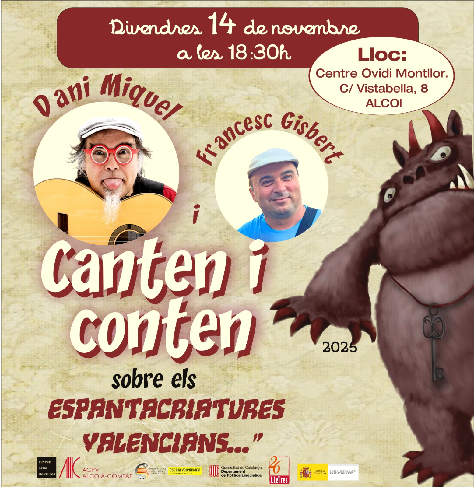 La següent activitat és aquest 14 de novembre a les 18:30h a la seu del Centre Cultural sota el títol "Canten i conten sobre els espantacriatures valencians", una proposta cultural que uneix música i narració per recuperar les figures més emblemàtiques del folklore valencià. Participen a l’espectacle Dani Miquel i Francesc Gisbert, escriptor i contacontes, que faran reviure personatges com el Butoni, la Quarantamaula o el Sac, amb cançons i històries que faran les delícies de grans i menuts.