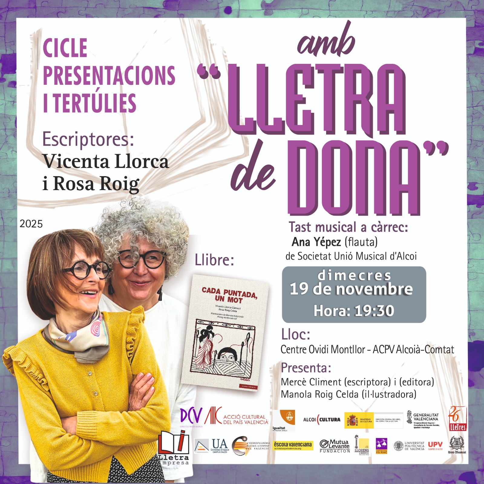 I per últim, el 19 de novembre a les 19:30h a la seu del Centre Cultural, té lloc el Cicle ‘Amb lletra de Dona’. En aquesta tertúlia-presentació es parlarà de ‘Cada puntada, un mot’, una obra col·lectiva de Vicenta Llorca i Rosa Roig, que convida a explorar les emocions a través de la paraula i la imatge. També acompanyaran a les autores, l’editora de Lletra Impresa Mercè Climent i la il·lustradora del llibre Manola Roig. L’acte comptarà amb un tast musical en directe a càrrec de la flautista Ana Yépez, de la Societat Unió Musical d’Alcoi, qui interpretarà una peça inspirada en el llibre, convertint-lo en banda sonora viva de la vesprada.