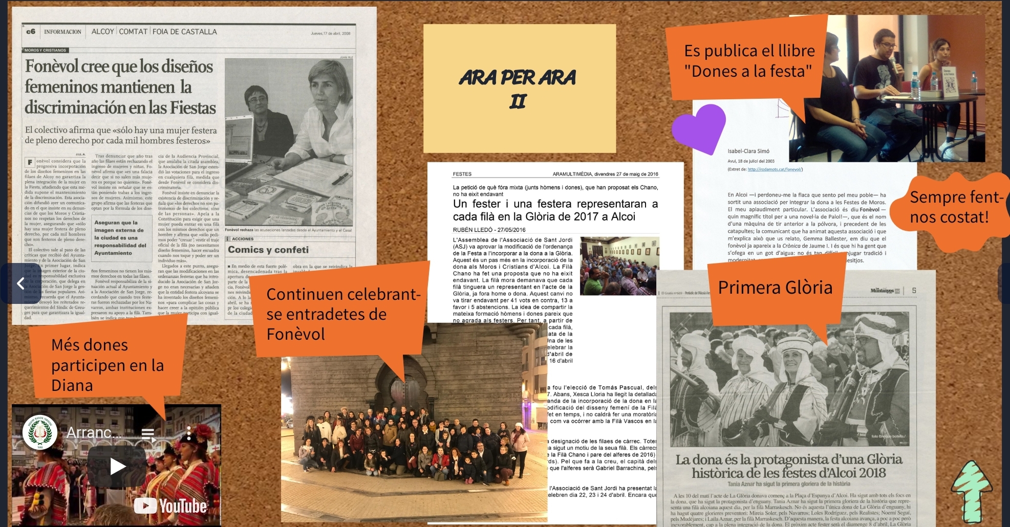 La mostra es va preparar l'any 2019, i es va mostrar al Club d'Amics de la UNESCO i a l'entrada de l'Ajuntament d'Alcoi. Però va arribar la pandèmia i j a no es va exposar en cap lloc més. Des de FONÈVOL, per commemorar el 8 de març, han reproduït l'exposició en línia. "No es tracta d’un producte per llegir-lo tot d’una, és més per anar picant ací i allà i deixar-se sorprendre per les coses que s’han fet i s’han arribat a dir, i per alegrar-se de les fites aconseguides".