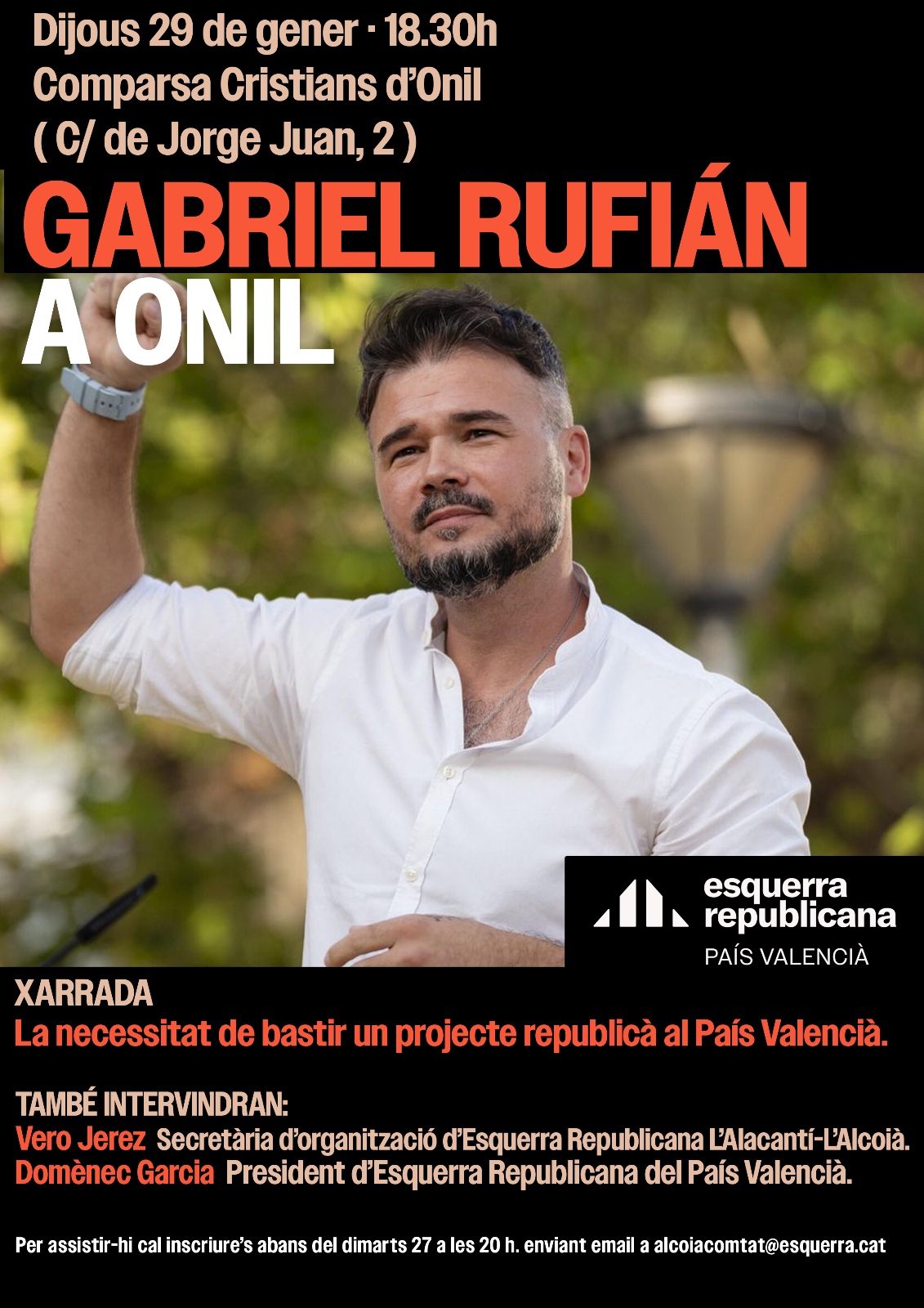 L'acte s'emmarca en una gira de dos dies en què Rufián recorrerà diverses comarques per a escoltar les classes populars i els sectors productius. A la cita d'Onil, el diputat estarà acompanyat per Domènec Garcia, president d’ERPV, i Vero Jerez, representant d'Esquerra Republicana Xixona.