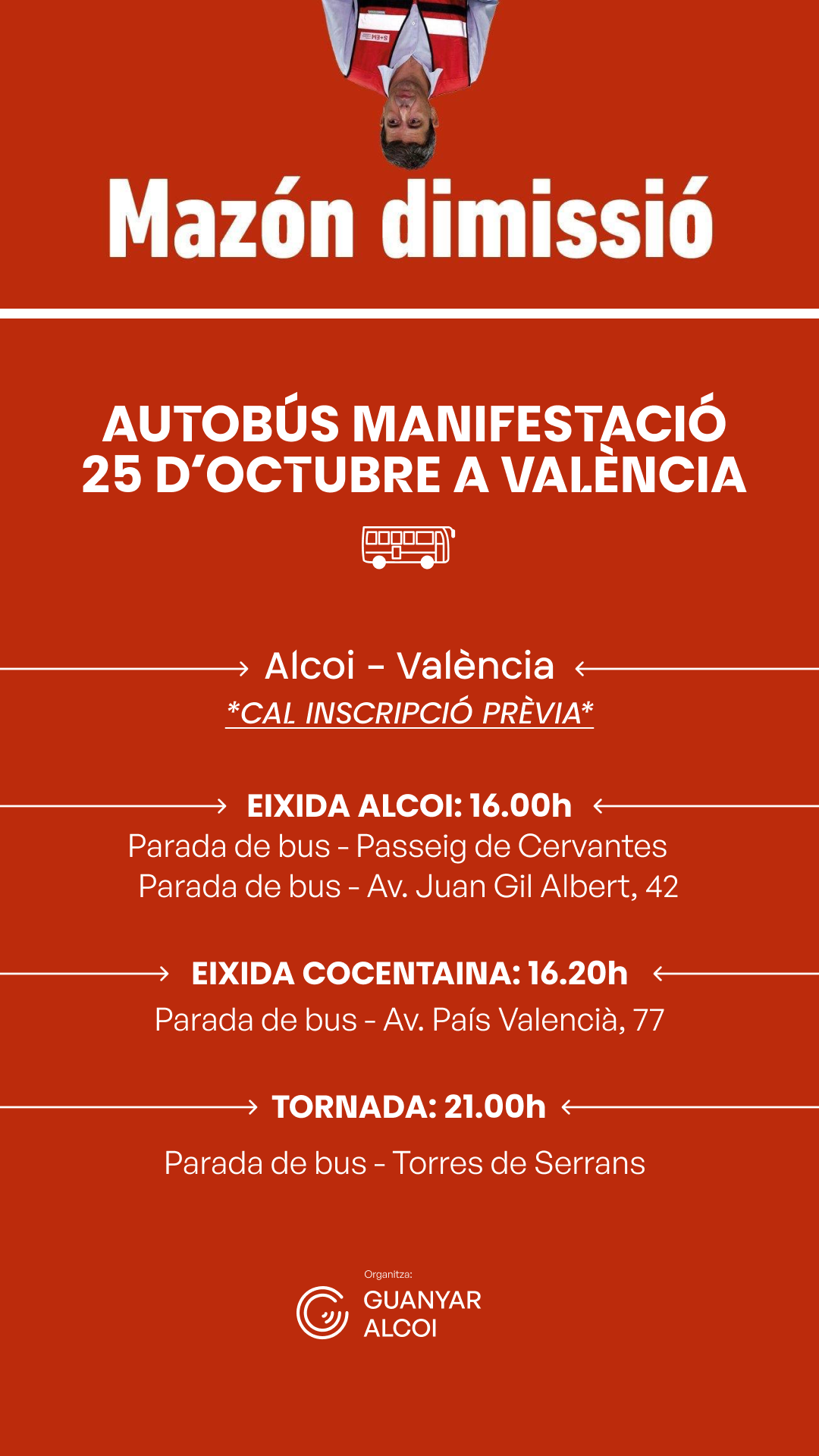 I just el dia després, aquest 25 d’octubre té lloc a València una mobilització amb motiu de l’any des que va succeir la DANA. La manifestació és a València sota el lema ‘Mazón dimissió’. Guanyar Alcoi vol recordar que fa un any la ciutadania valenciana va eixir al carrer per denunciar la gestió negligent del govern de Mazón davant la DANA, i que “les raons per reclamar responsabilitats continuen plenament vigents”.