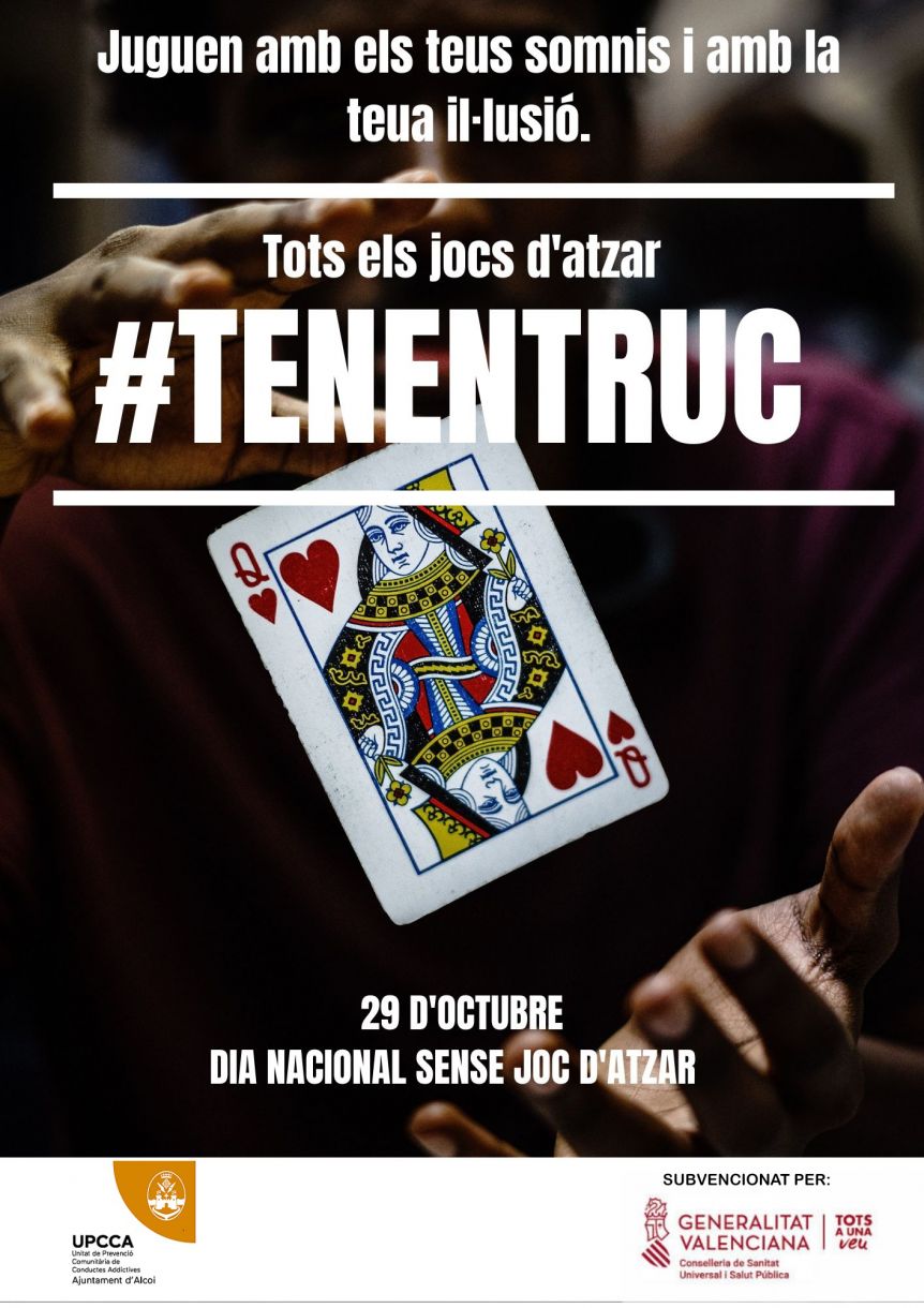 Aquest dijous 29 d'octubre es commemora el Dia Internacional sense Jocs d'Atzar. L'Ajuntament d'Alcoi, la Generalitat, el GARA o la Mancomunitat s'han sumat a la campanya 'Tots els jocs d'Atzar #TenenTruc', que naix amb la idea de visibilitzar el risc de tots els jocs d'atzar i desmuntar mites associats a ells. El GARA i la Unitat de Prevenció Comunitària en Conductes Adictives (UPCCA) volen conscienciar amb vídeos d'històries personals per empatitzar millor amb aquest problema social.