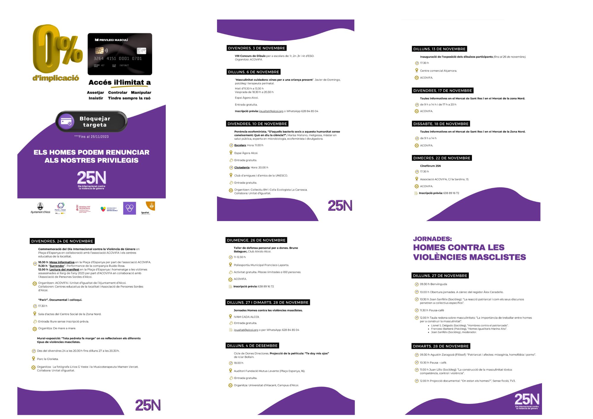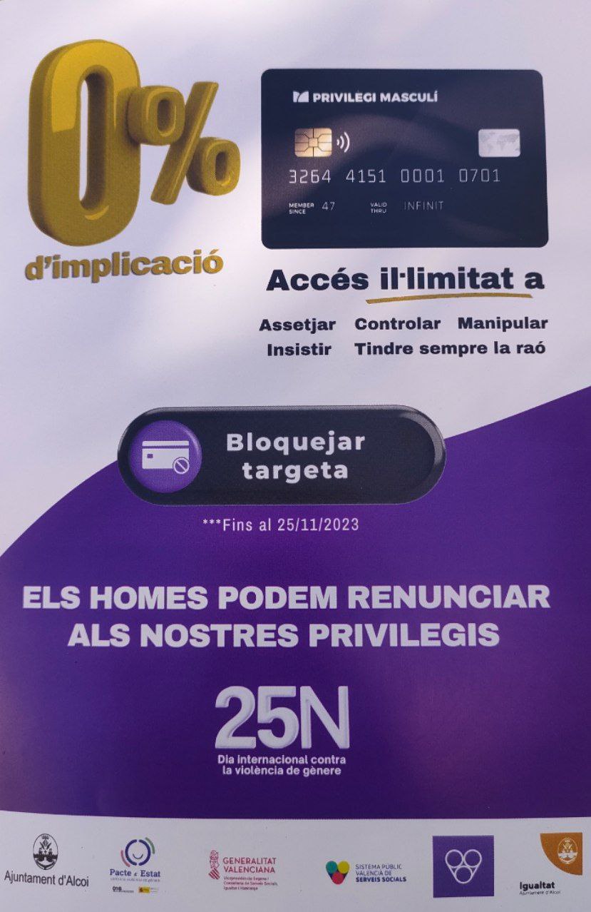 Així, el fullet que inclou tota la programació comença amb una mena de promoció publicitària d'una targeta de crèdit que permet, "amb el 0% d'implicació, tindre accés il·limitat a assetjar, controlar, manipular, insistir i tindre sempre la raó". Però esta targeta es pot bloquejar, perquè "els homes podem renunciar als nostres privilegis".