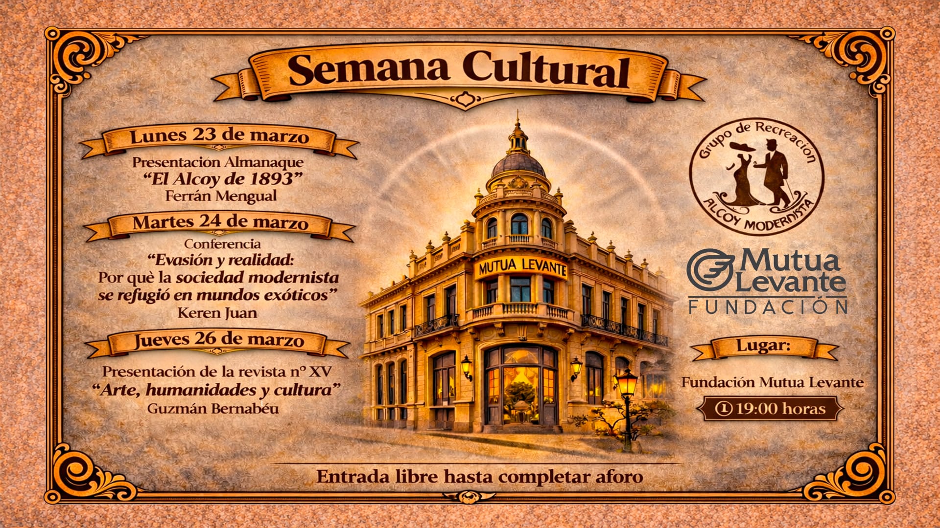 El Grup de Recreació Alcoy Modernista ha preparat una nova edició de la seua Setmana Cultural, un cicle d’activitats que tindran lloc a la Fundació Mutua Levante amb l’objectiu de difondre la història, la societat i la cultura de l’Alcoi de finals del segle XIX.