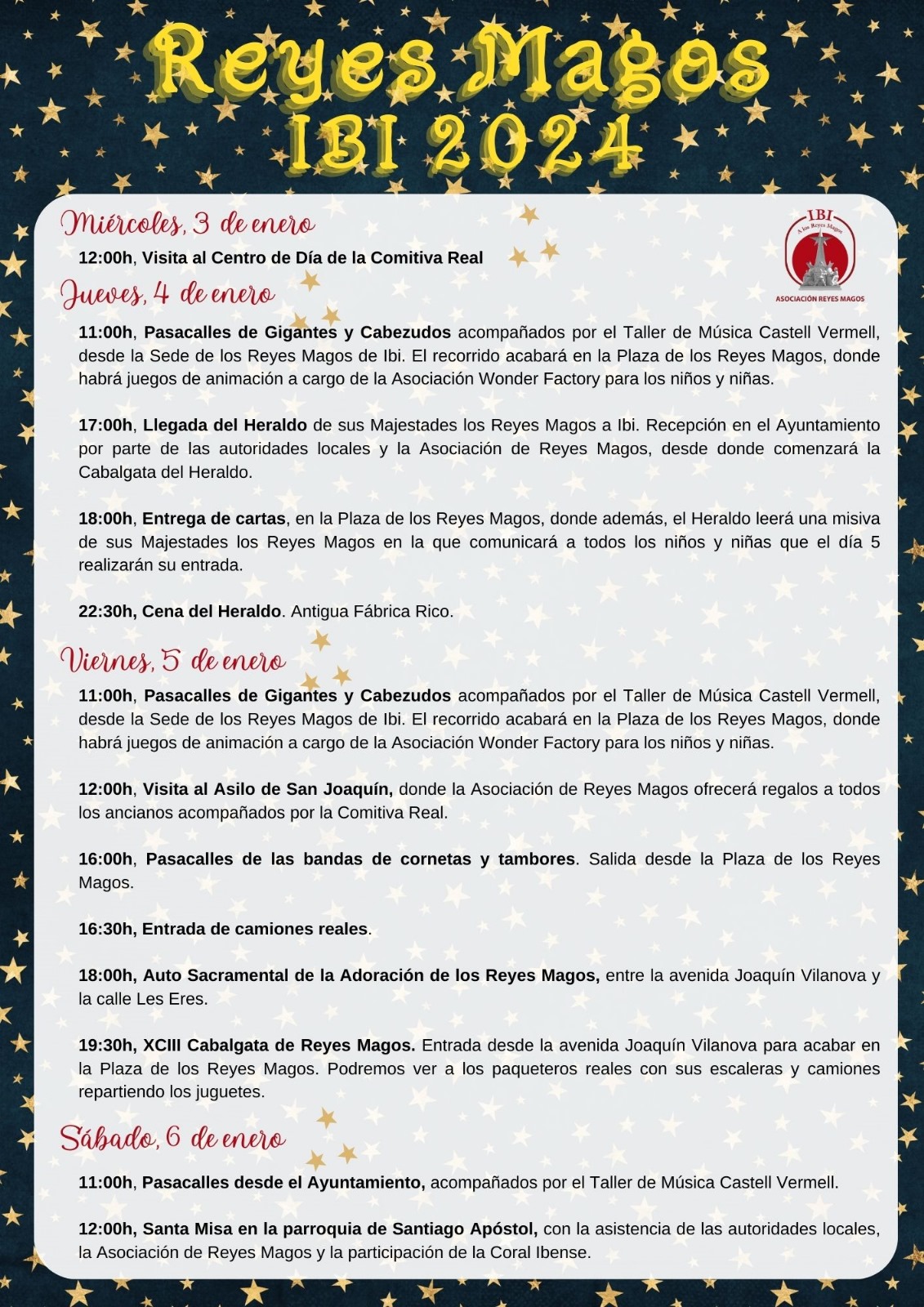 Els actes centrals s'iniciaran dijous que ve 4 de gener a les 11.00 hores amb la cercavila de Gegants i Capgrossos que des de la Seu d'associació recorrerà els carrers d'Ibi acompanyats per la música de Castell Vermell i que acabarà en la plaça dels Reis Mags amb activitats i jocs d'animació per al públic infantil.