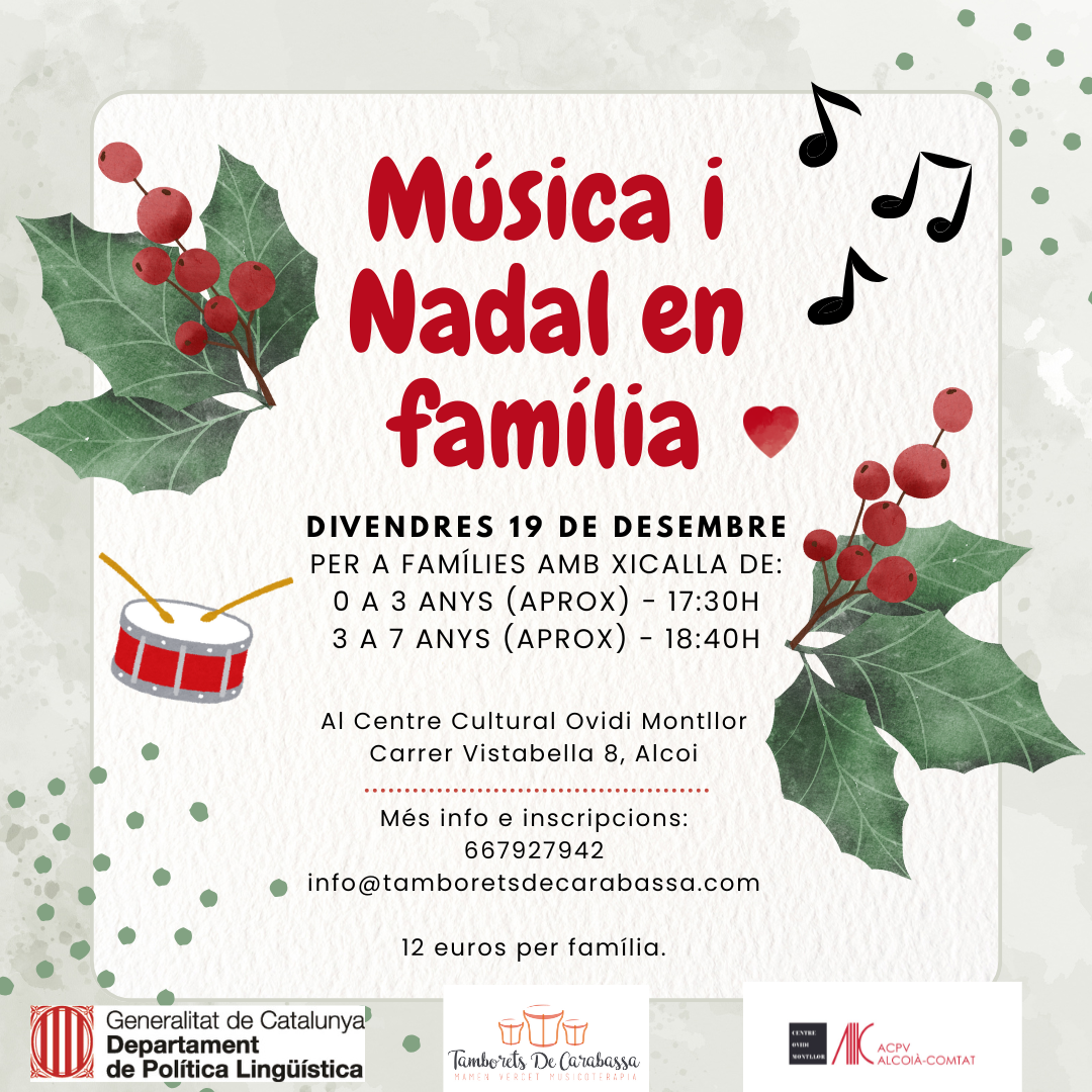 La programació es completa amb el taller “Música i Nadal en Família”, una activitat dinamitzada per la musicoterapeuta Mamen Vercet que convida xiquets i adults a cantar, tocar instruments i gaudir del moviment i la percussió corporal. Tindrà lloc el 19 de desembre.