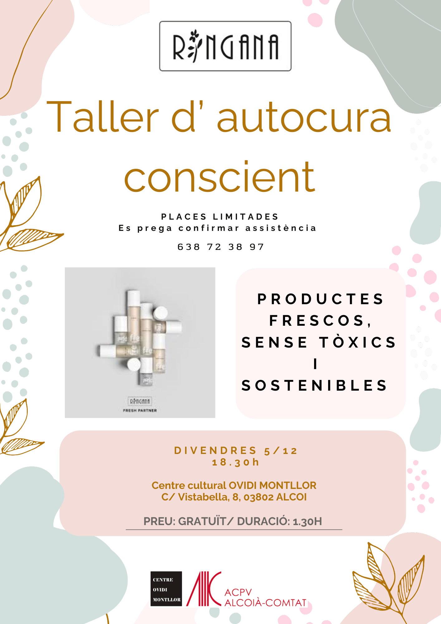 El 5 de desembre, a les 18.30 h, el Centre acull un nou Taller d’Autocura Conscient conduït per Júlia, artesana i difusora del projecte austríac Ringana, basat en productes de cosmètica i suplementació fresca, vegana i sostenible. El taller és gratuït i permet provar els productes mentre es comparteix un espai de benestar i cura personal.