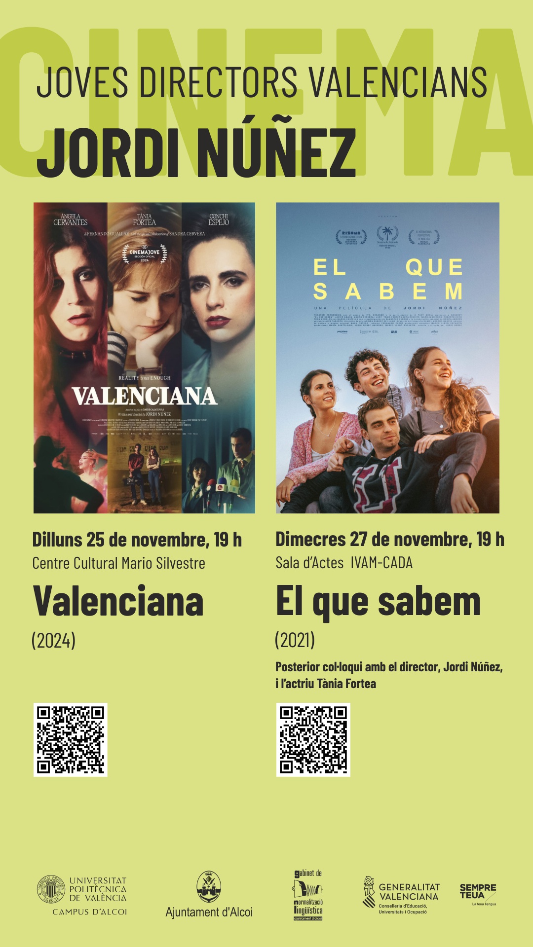 'Valenciana' i 'El que sabem' són dos pel·lícules fetes a València, amb director, actors i actrius valencians, "una mostra de la inesgotable capacitat creativa dels artistes valencians". Les dos pel·lícules es podran vore a Alcoi gràcies a la col·laboració del Gabinet de Normalització Lingüística de l'Ajuntament d'Alcoi i la Universitat Politècnica de València.