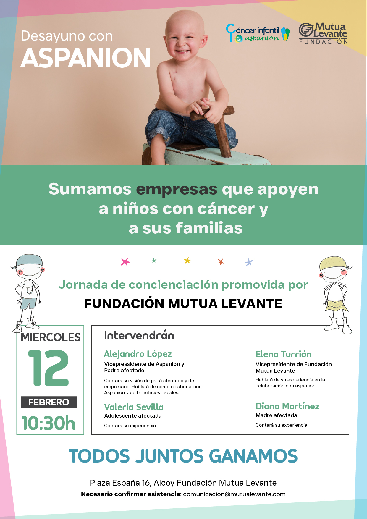 Fundación Mutua Levante celebra el 'Desdejuny amb ASPANION', una jornada de conscienciació sobre el càncer infantil on sabrem més d'esta malaltia pels seus protagonistes. Intervindrà Valeria Sevilla, una jove adolescent afectada; i Diana Martínez, mare afectada. També el vicepresident d'ASPANION, Alejandro López, qui parlarà de la seua visió com a pare afectat i empresari, i detallarà els beneficis fiscals de col·laborar amb ASPANION. Des de Mutua, la vicepresidenta de la Fundació, Elena Turrión, parlarà de la seua experiència col·laborant amb ASPANION.