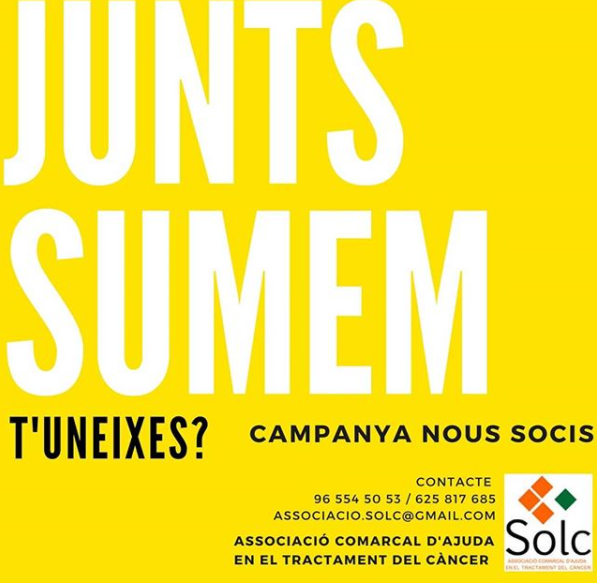 L'Associació Comarcal d'ajuda en el tractament del Càncer (SOLC) ha iniciat una nova campanya de captació de socis anomenada 'Junts sumem! T'uneixes?'. La quota anual per fer-se soci de SOLC és de 40 euros.