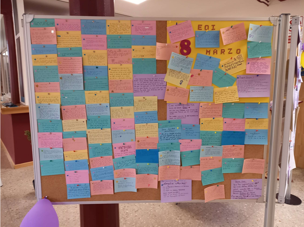 La passada setmana es va celebrar el Dia Internacional de la Dona i l’escola Oficial d’Idiomes d’Alcoi va voler sumar-se participant amb una activitat que va consistir en omplir el centre amb targetes escrites en les que l’alumnat va expressar la seva admiració per alguna dona. En finalitzar la setmana d’actes al voltant del 8M es va compondre un mosaic amb totes les targetes.