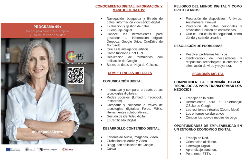 Entre els continguts, avalats pel Marc Europeu de competències digitals per a ciutadans, constarà dels següents blocs: informatització i alfabetització digital, comunicació i col·laboració, creació de contingut digital, seguretat i resolució de problemes, així com l’acompanyament cap al treball.