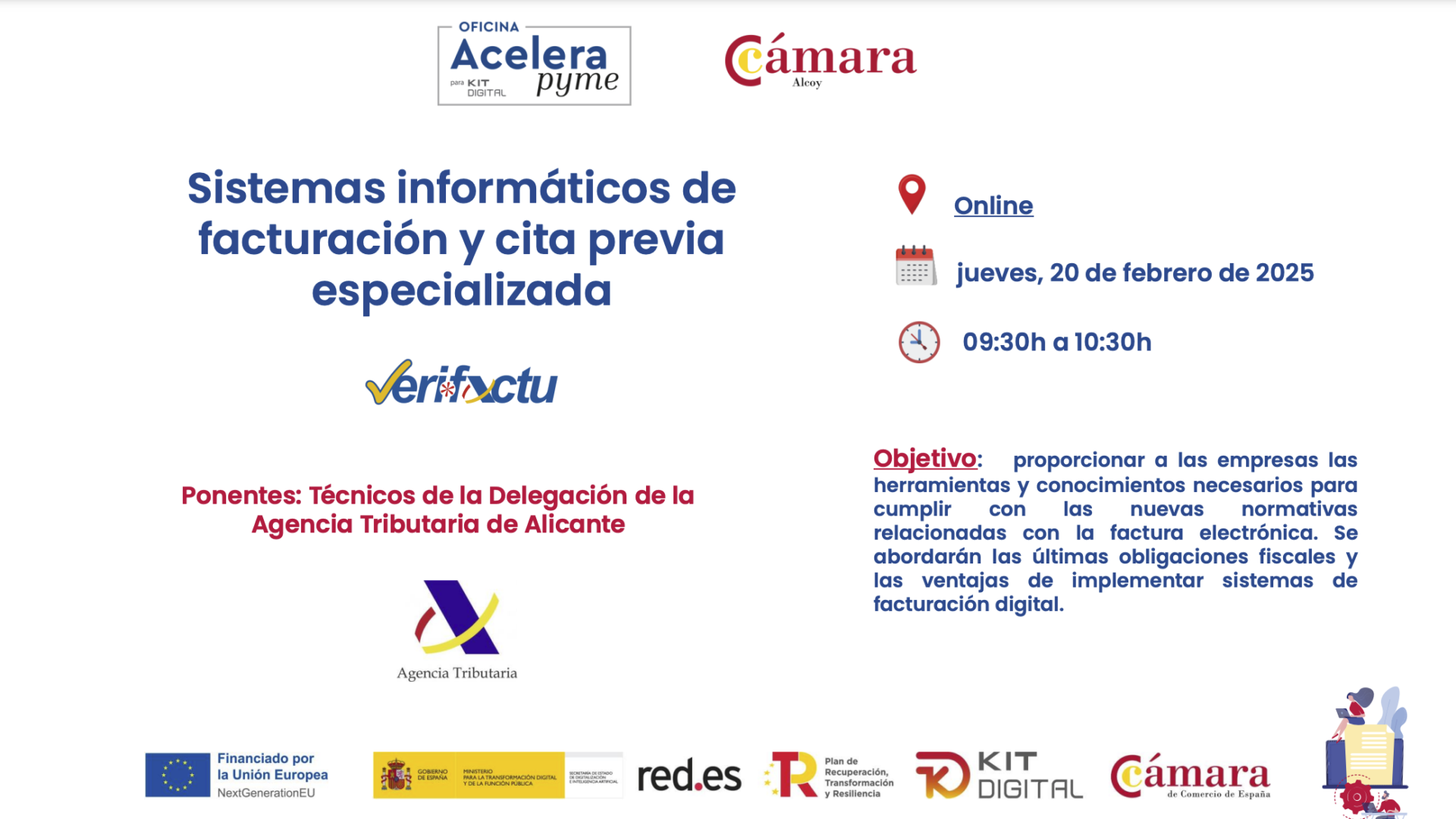 La Cambra de Comerç d'Alcoi anima a totes les associacions i professionals interessats a participar en aquesta jornada, que serà una oportunitat per a resoldre dubtes i conéixer millor les obligacions i opcions disponibles en matèria de facturació electrònica i gestió tributària.
