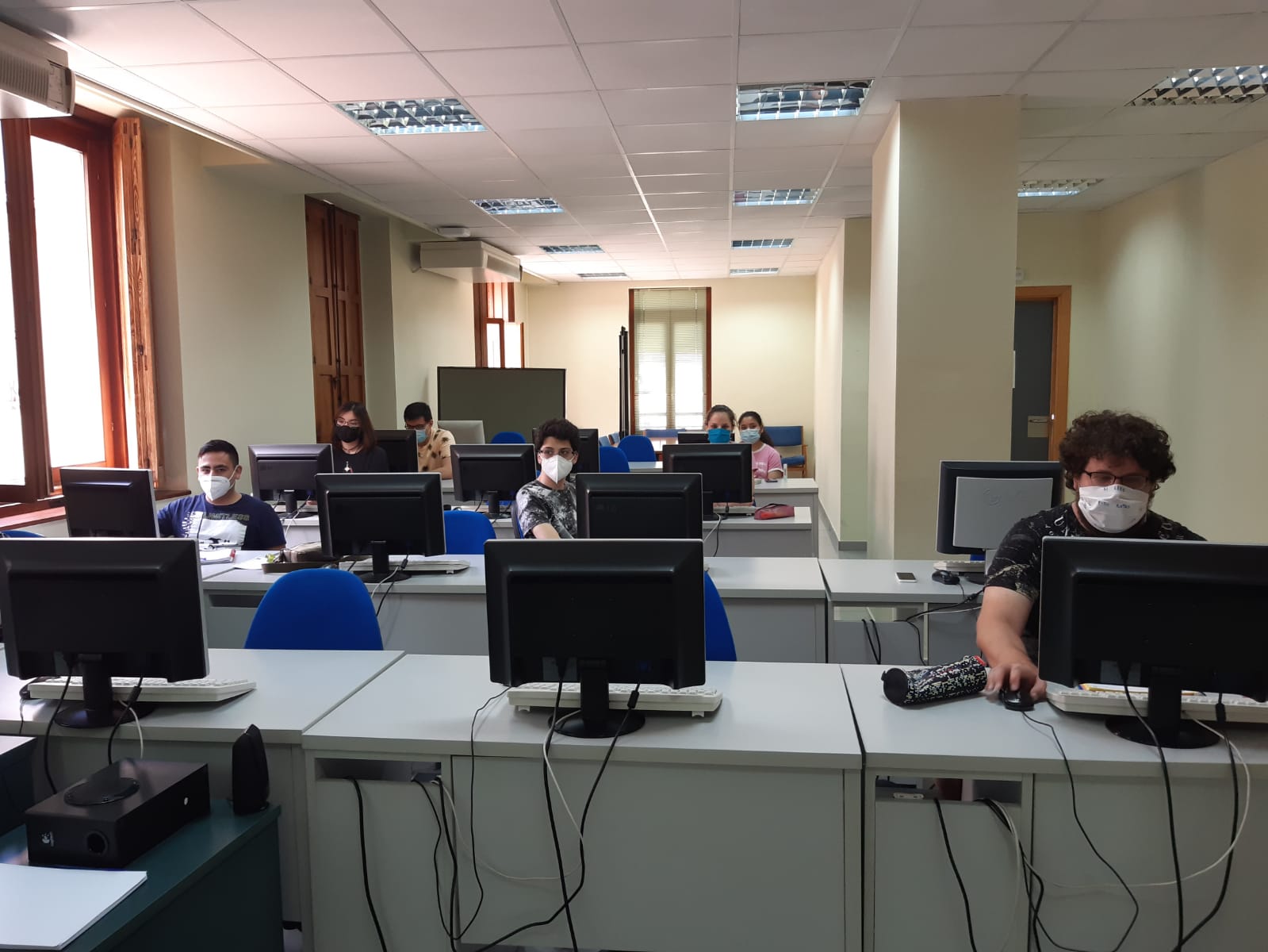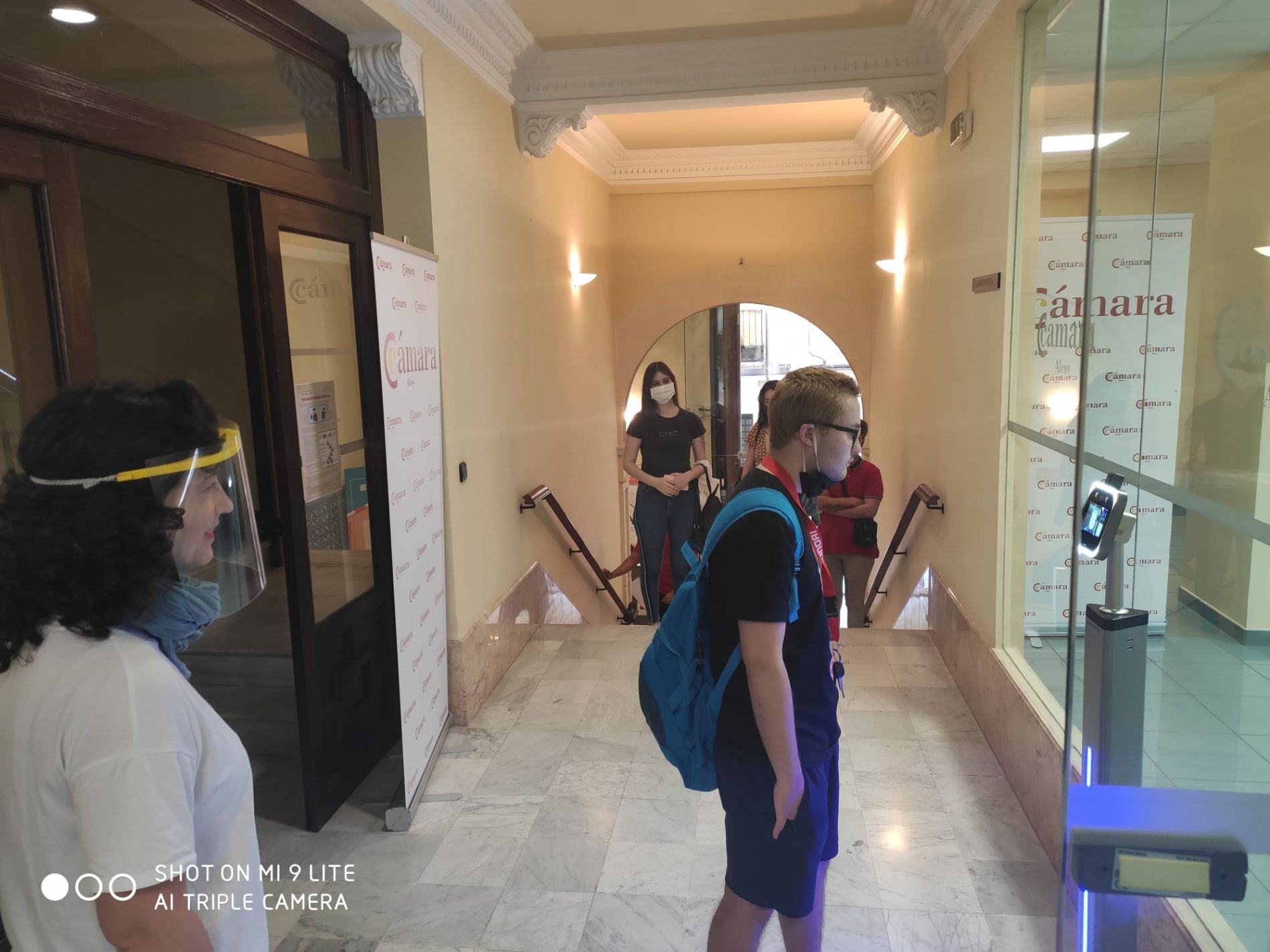 Accedeixen per la porta principal de la Cambra, on els prenen la temperatura corporal gràcies a un controlador d'última generació que funciona amb sensors. Sempre amb mascareta, es desinfecten amb gel hidroalcohòlic. L'alumnat del programa PICE ha représ les seues casses dels cursos de Comunicació digital i d'Habilitats socials per a trobar faena. Dos cicles que quedaren a mitges per culpa de la Covid19 el 13 de març.