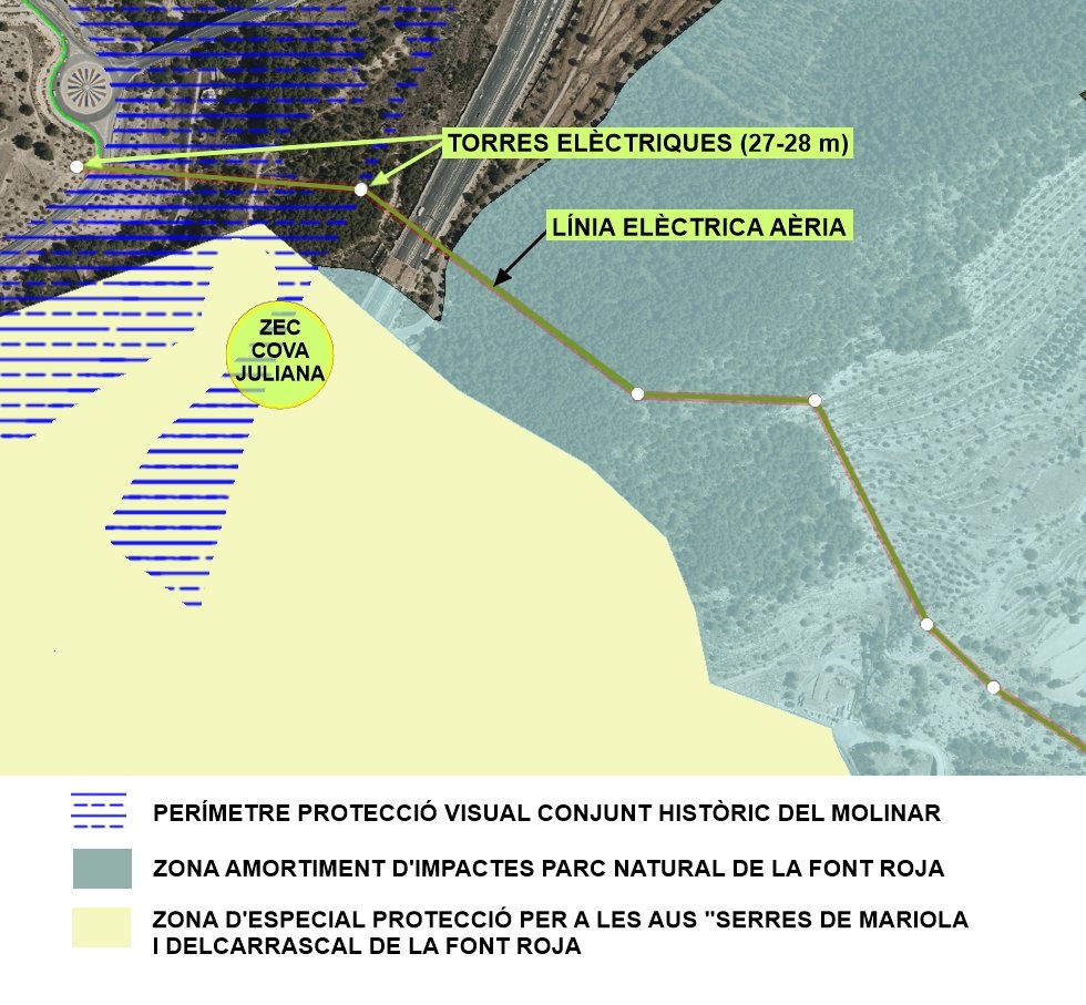 Des de la Colla asseguren que no es va fer valoració conjunta de les diferents ubicacions proposades per a la planta fotovoltaica i de la línia elèctrica d'evacuació de cadascuna, perquè eixa valoració hauria provocat que es descartara el lloc pels impactes que té la línia aèria. Detallen que infringeix el Pla d'Ordenació dels Recursos Naturals del parc natural del Carrascal de la Font Roja; afecta les espècies d'ocells prioritàries que van motivar la declaració de la Zona d'Especial Protecció per a les Aus Serres de Mariola i de la Font Roja, "principalment l'àguila cuabarrada (una de les escasses parelles de l'espècie a la província d'Alacant té el punt de cria a uns 600-700 metres de distància de la línia)"; té un impacte paisatgístic greu; i és incompatible amb les determinacions de la Llei d'ordenació del territori, urbanisme i paisatge i amb les directrius de l'Estratègia Territorial de la Comunitat Valenciana. També afecta el Perímetre de Protecció Visual del Conjunt Històric del Molinar, "amb un impacte negatiu sobre este recurs paisatgístic d'alt valor, tant per la línia elèctrica que el travessaria com per la construcció de dos torres elèctriques de 28 i 27 metres (l'altura d'un edifici d'unes 8 plantes)"; i incompleix les recomanacions de la Declaració Ambiental Estratègica del Pla Nacional Integrat Energia i Clima 2021-2030.